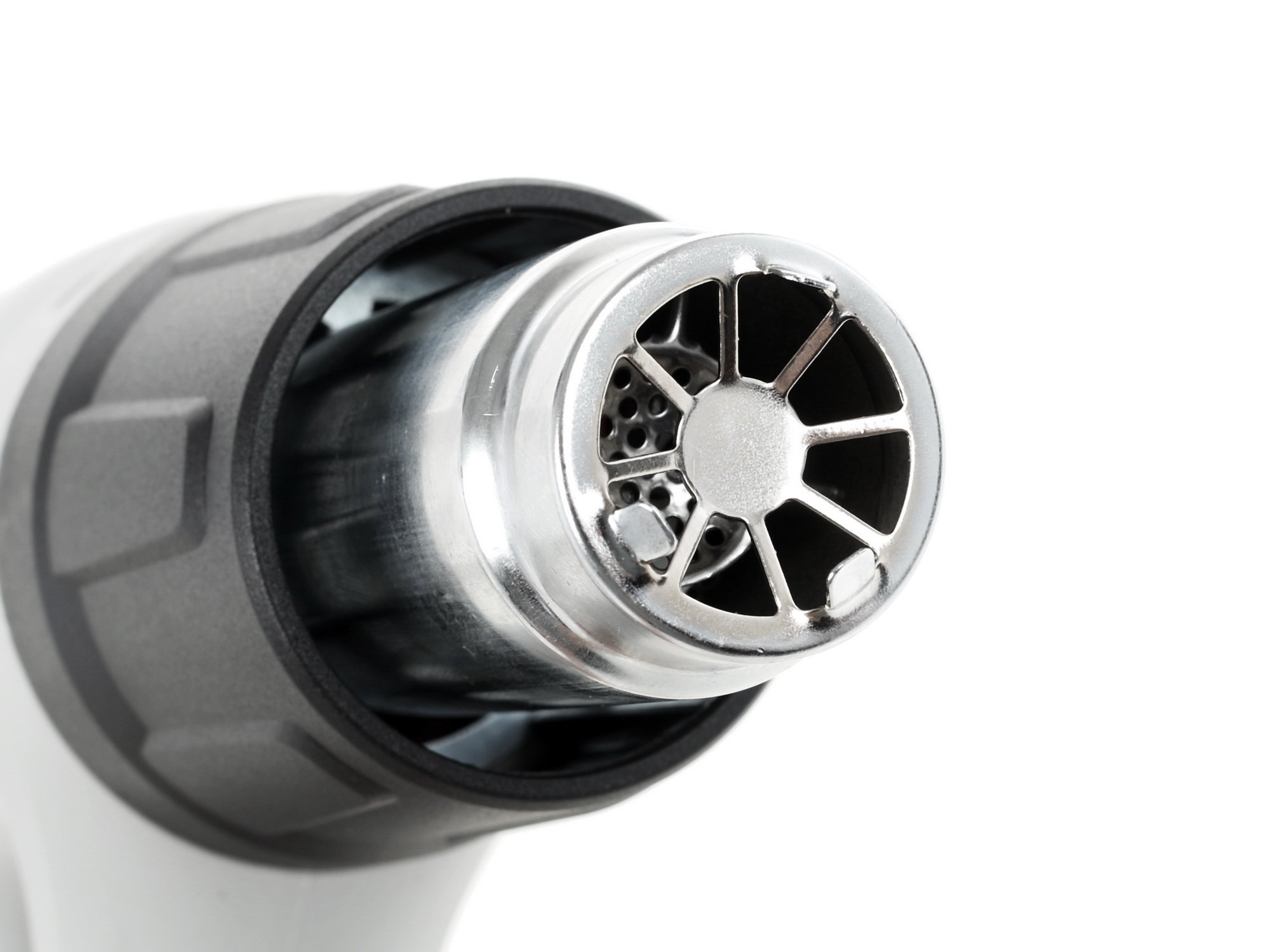 В комплекте поставляется четыре насадки для выполнения различных видов работ. Питается устройство от сети, длина шнура оптимальная для комфортного использования инструмента и составляет 2 метра. В конструкции присутствует дисплей, на который выводится основная информация. Вместе с феном предоставляется кейс, в нем можно осуществлять хранение и транспортировку.