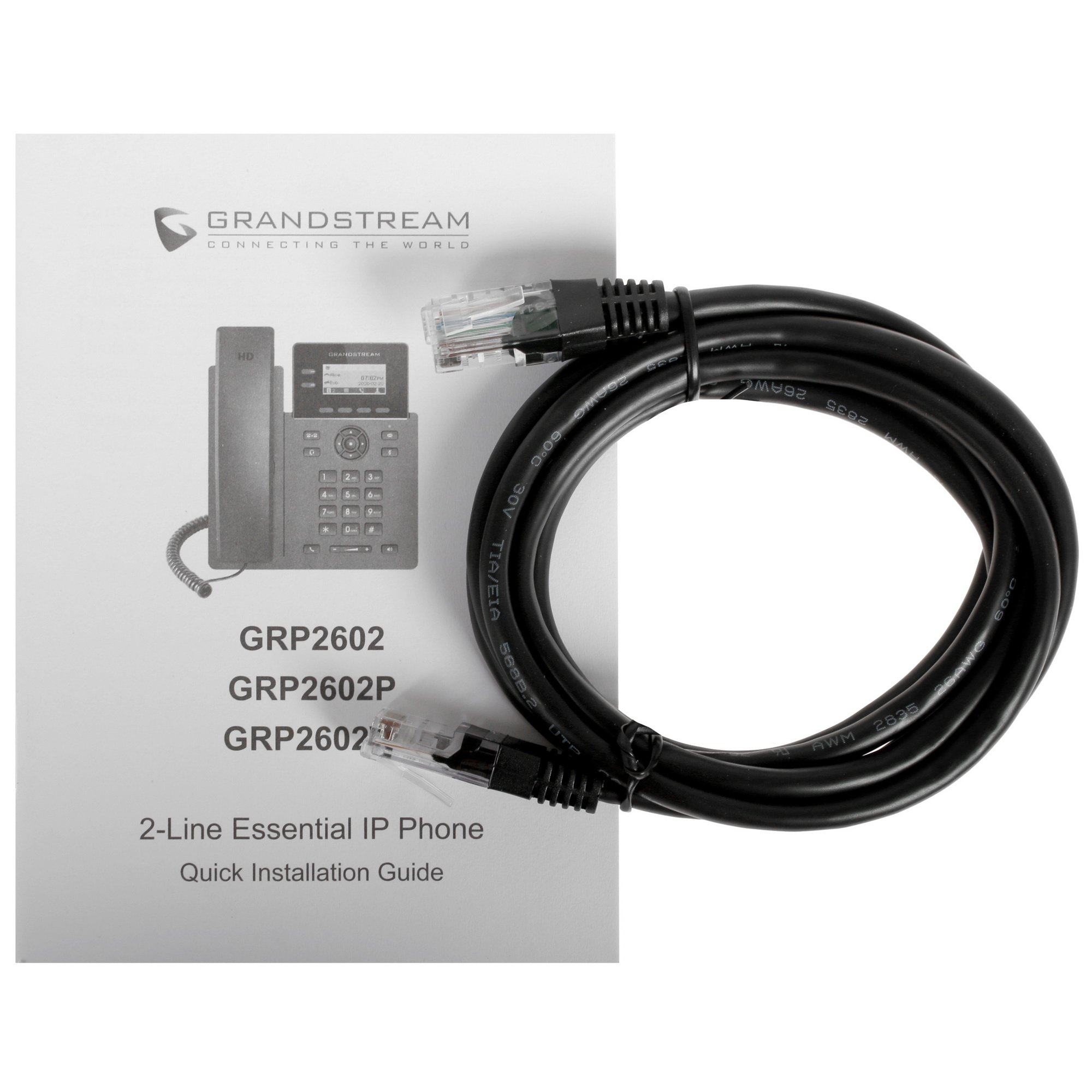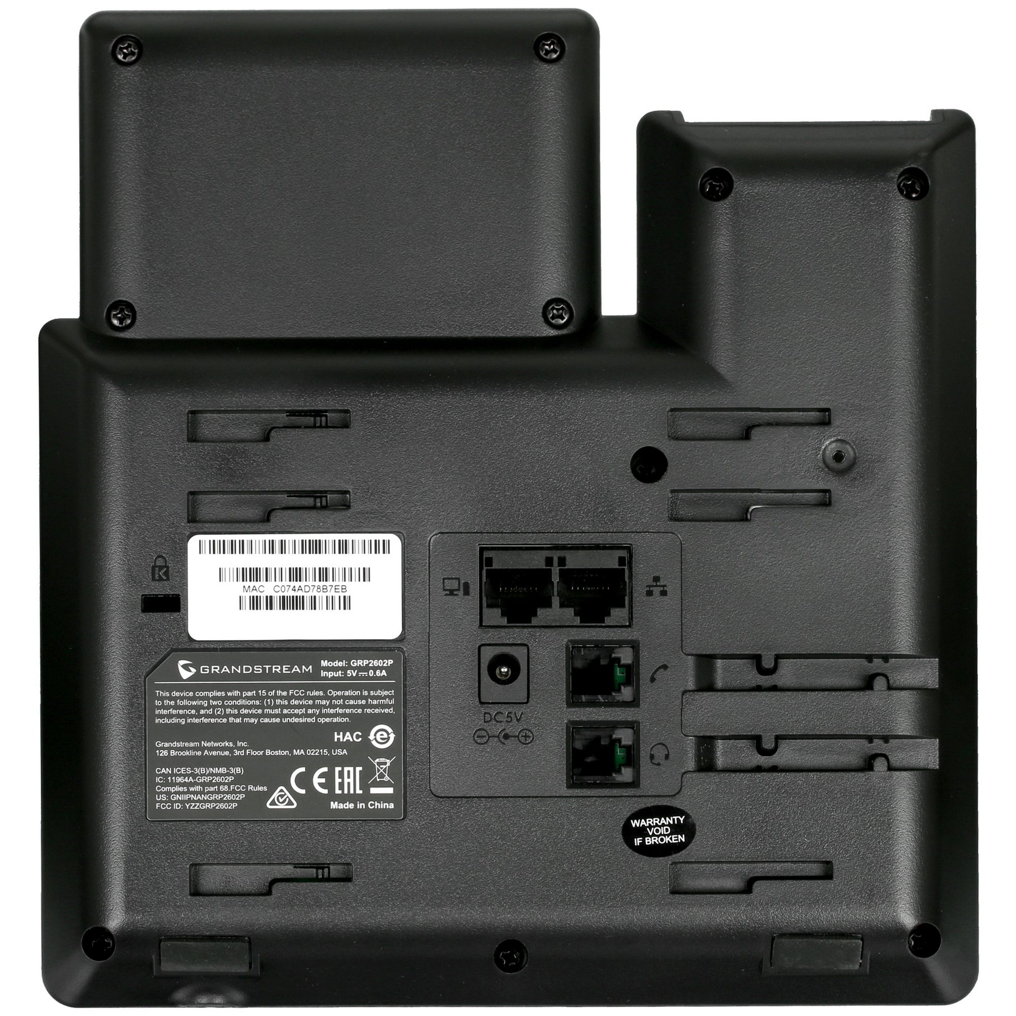 IP-телефон Grandstream GRP2602P оснащается разъемами подключения 1x RJ-9 и 2x RJ-45, а также портом для присоединения гарнитуры. Благодаря поддержке PoE аппарат может получать питание по кабелю Ethernet, использованному для его подключения к Интернету. Отдельный кабель питания при этом не требуется.