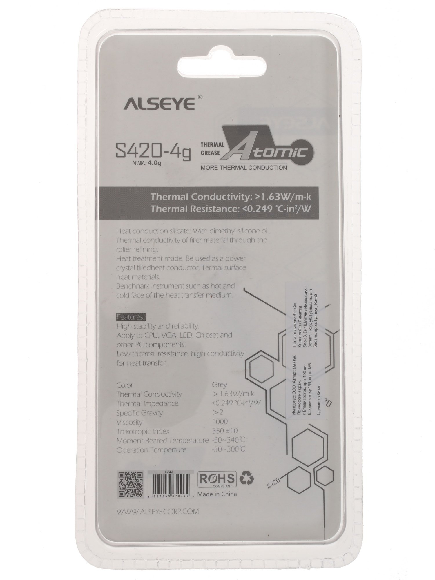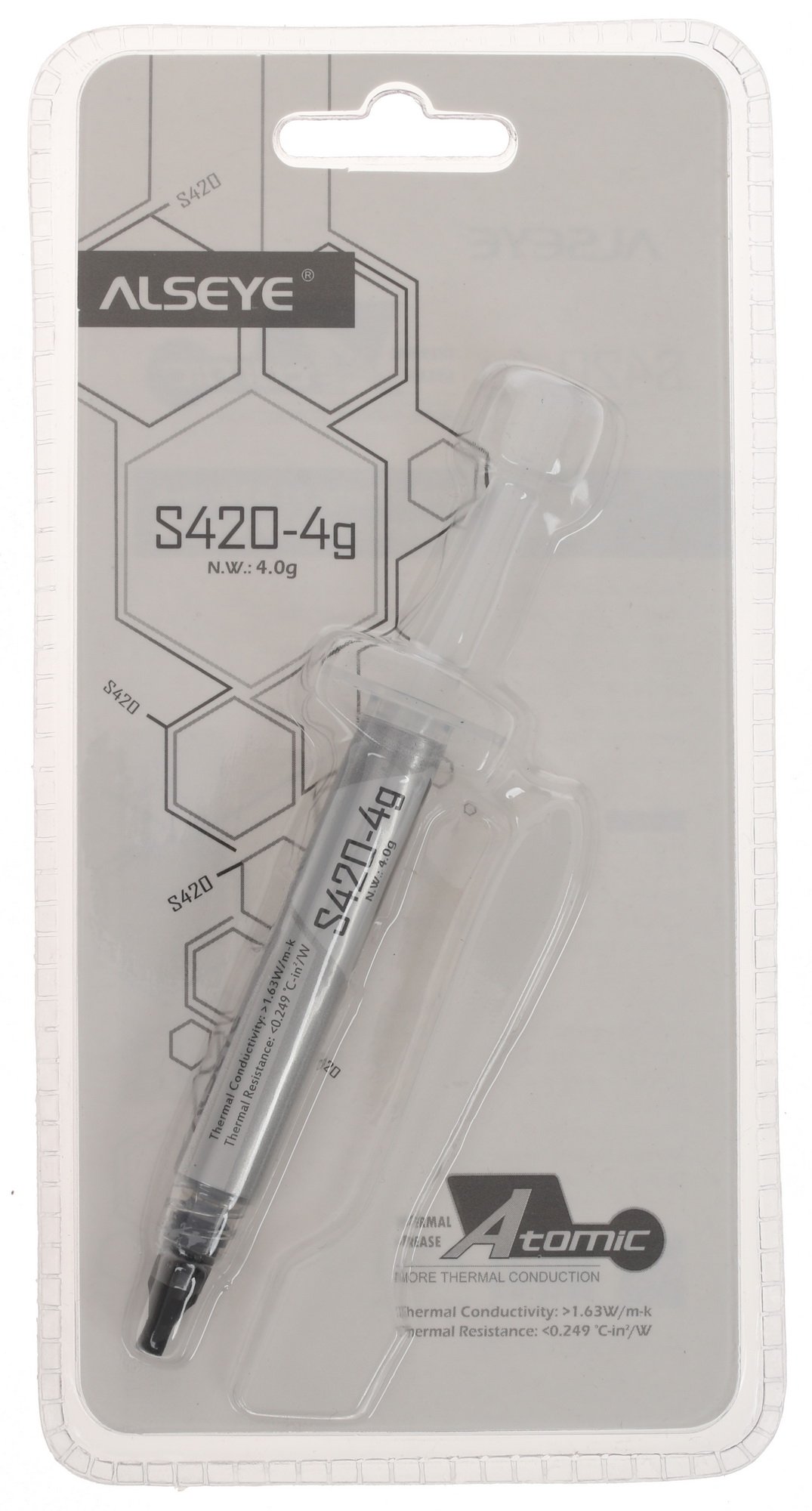 Термопаста Alseye S420 отличается простотой нанесения: упаковка с изделием представляет из себя компактный шприц. Масса термопасты равна 4 г. Эксплуатация аксессуара возможна при температурах от -30 до 300 °C. Шприц с термопастой помещен в блистер традиционной конструкции.