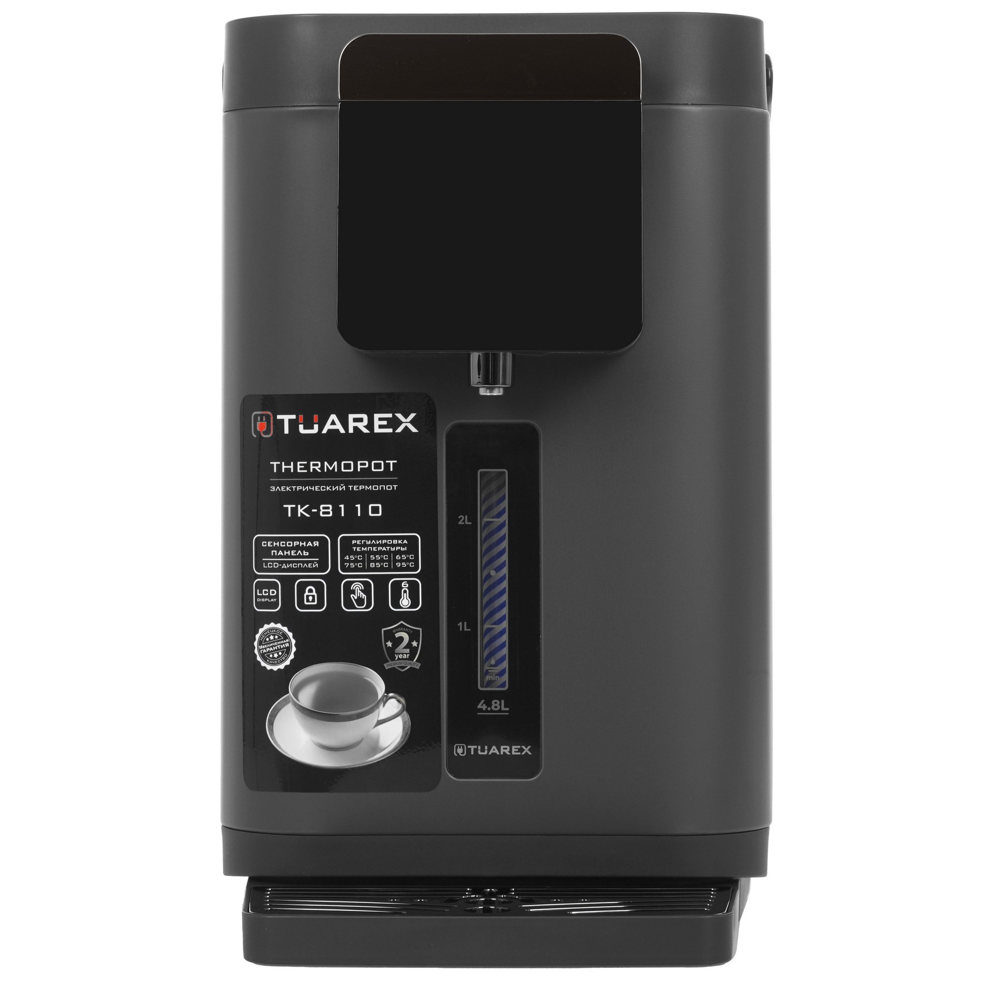 Термопот Tuarex TK-8110 оснащен сенсорной панелью управления и LCD- дисплеем для отслеживания режима работы. Подача воды осуществляется при нажатии кнопки. С ее помощью вы сможете регулировать объем подаваемой порции. Панель можно заблокировать для защиты от детей.