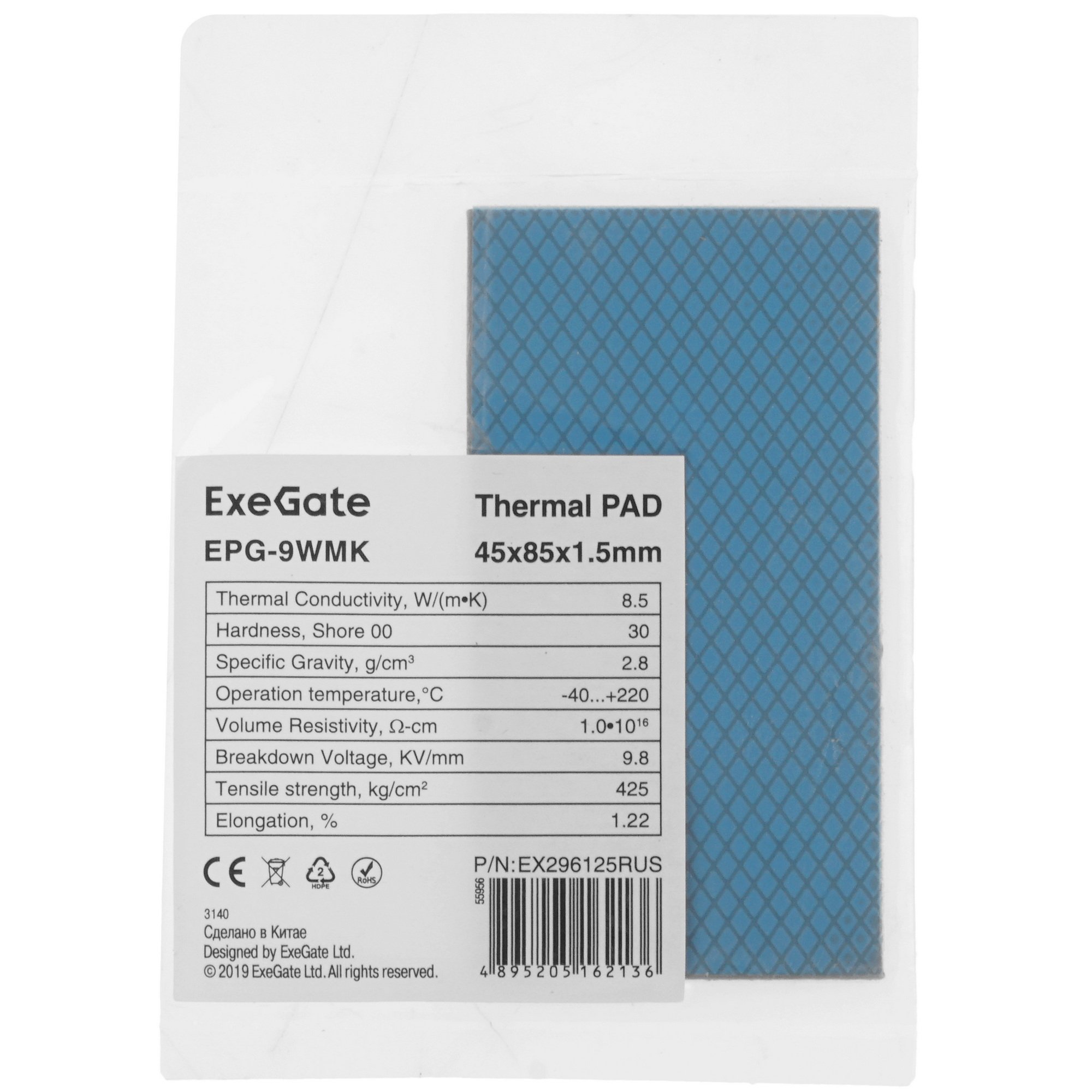 Термопрокладка ExeGate EPG-9WMK (45x85x1.5 мм, 8,5 Вт/ (м•К), теплопроводящая клейкая двухсторонняя)