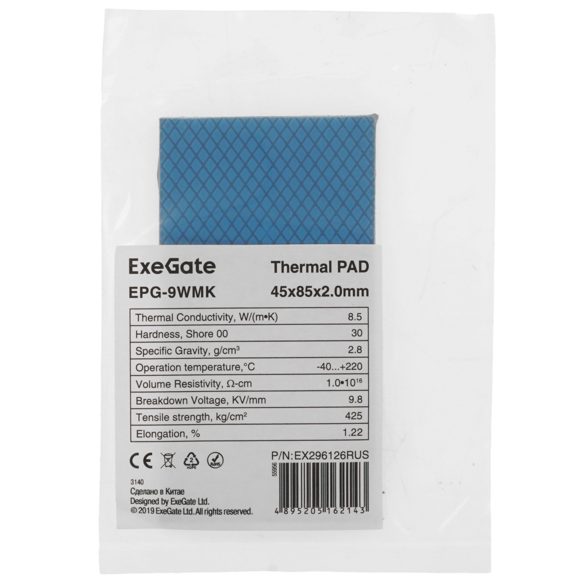 Термопрокладка ExeGate EPG-9WMK (45x85x2.0 мм, 8,5 Вт/ (м•К), теплопроводящая клейкая двухсторонняя)