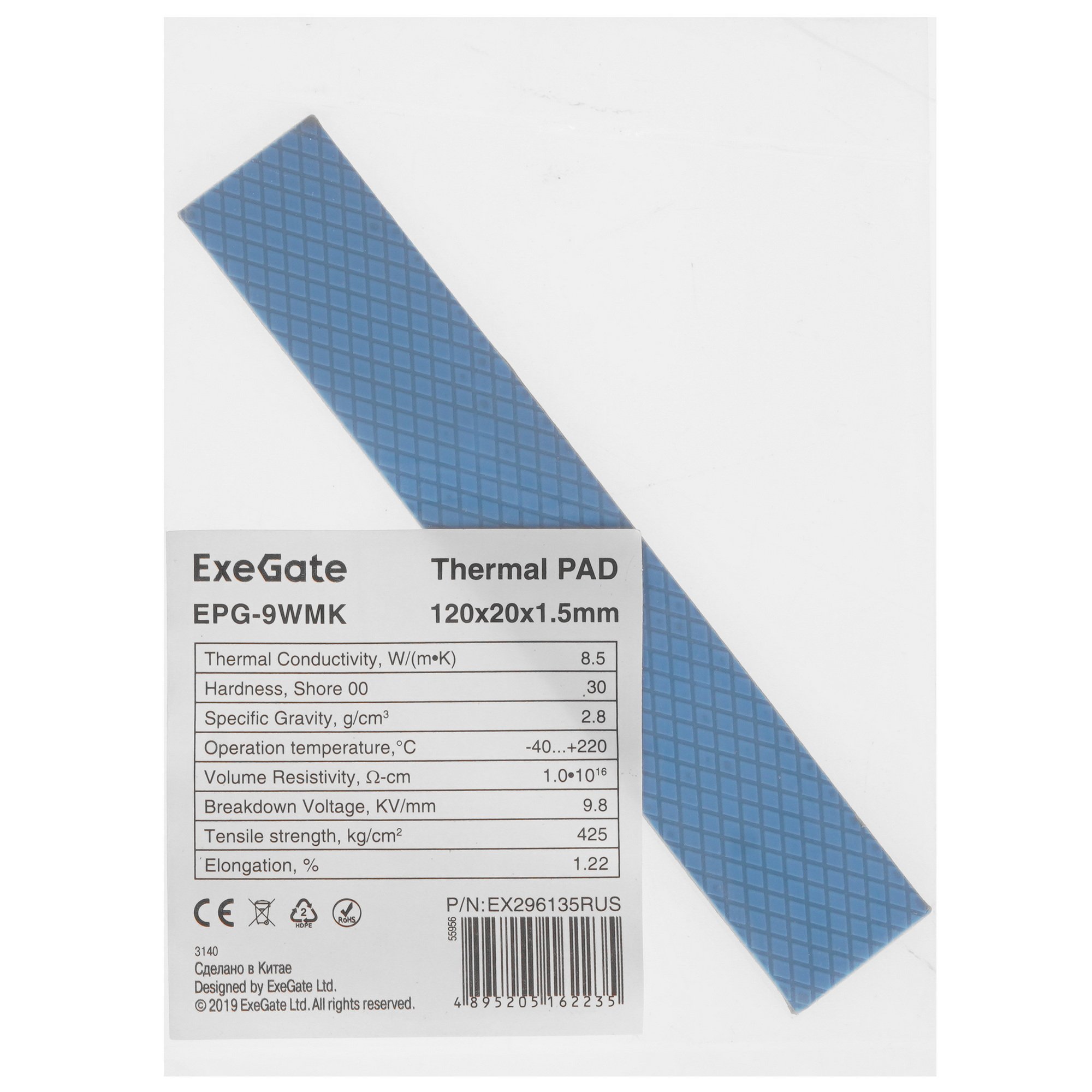 Термопрокладка ExeGate EPG-9WMK (20x120x1.5 мм, 8,5 Вт/ (м•К), теплопроводящая клейкая двухсторонняя)