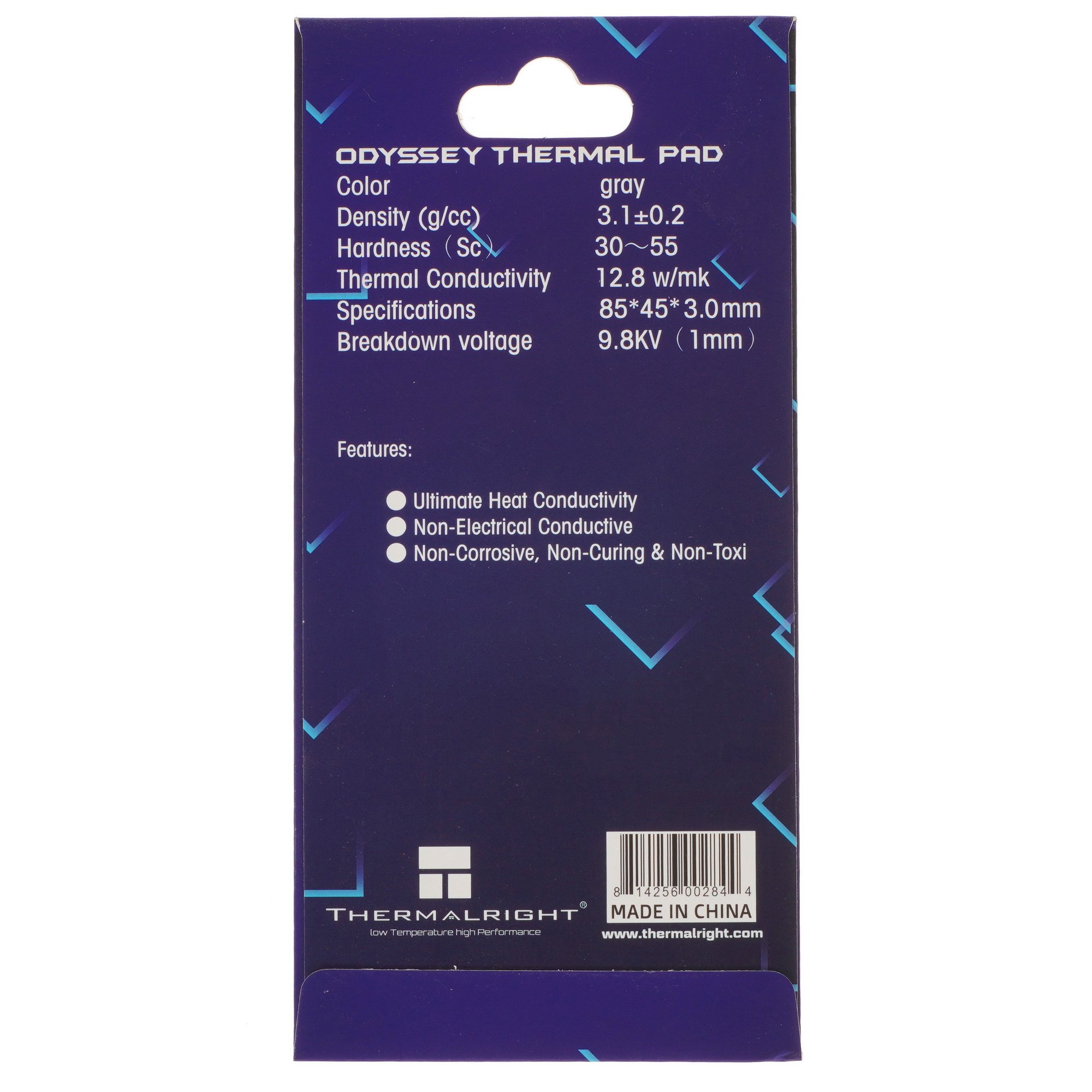 Термопрокладка Thermalright Odyssey [ODYSSEY-85X45-3.0] предназначена для отвода тепла с поверхности компонентов компьютеров, электронных устройств и другой техники. Теплопроводность изделия составляет 12.8 Вт/(м·К). Это высокий показатель. Он гарантирует повышенную интенсивность рассеивания тепла.