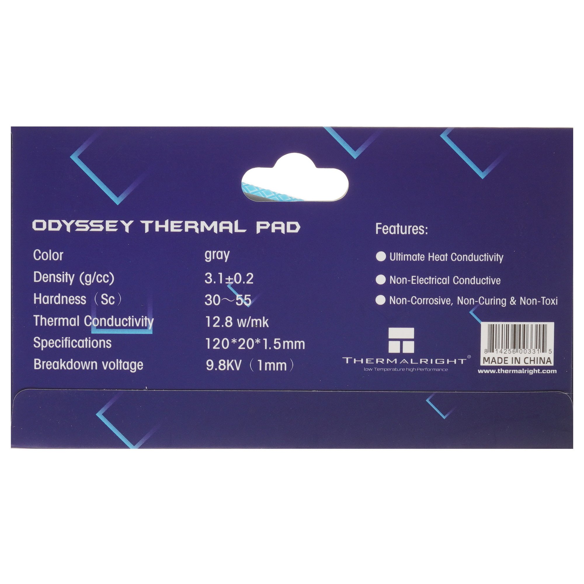 Термопрокладка Thermalright Odyssey [ODYSSEY-120X20-1.5] выполнена в виде прямоугольника со сторонами 120 и 20 мм. Толщина изделия составляет 1.5 мм. Цвет прокладки – серый. Форма изделия при необходимости корректируется с помощью ножниц или резака.