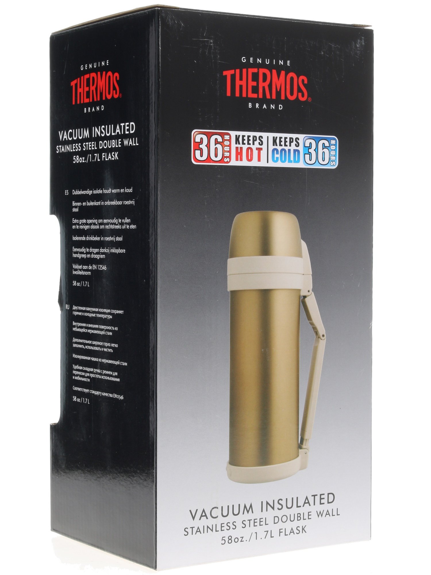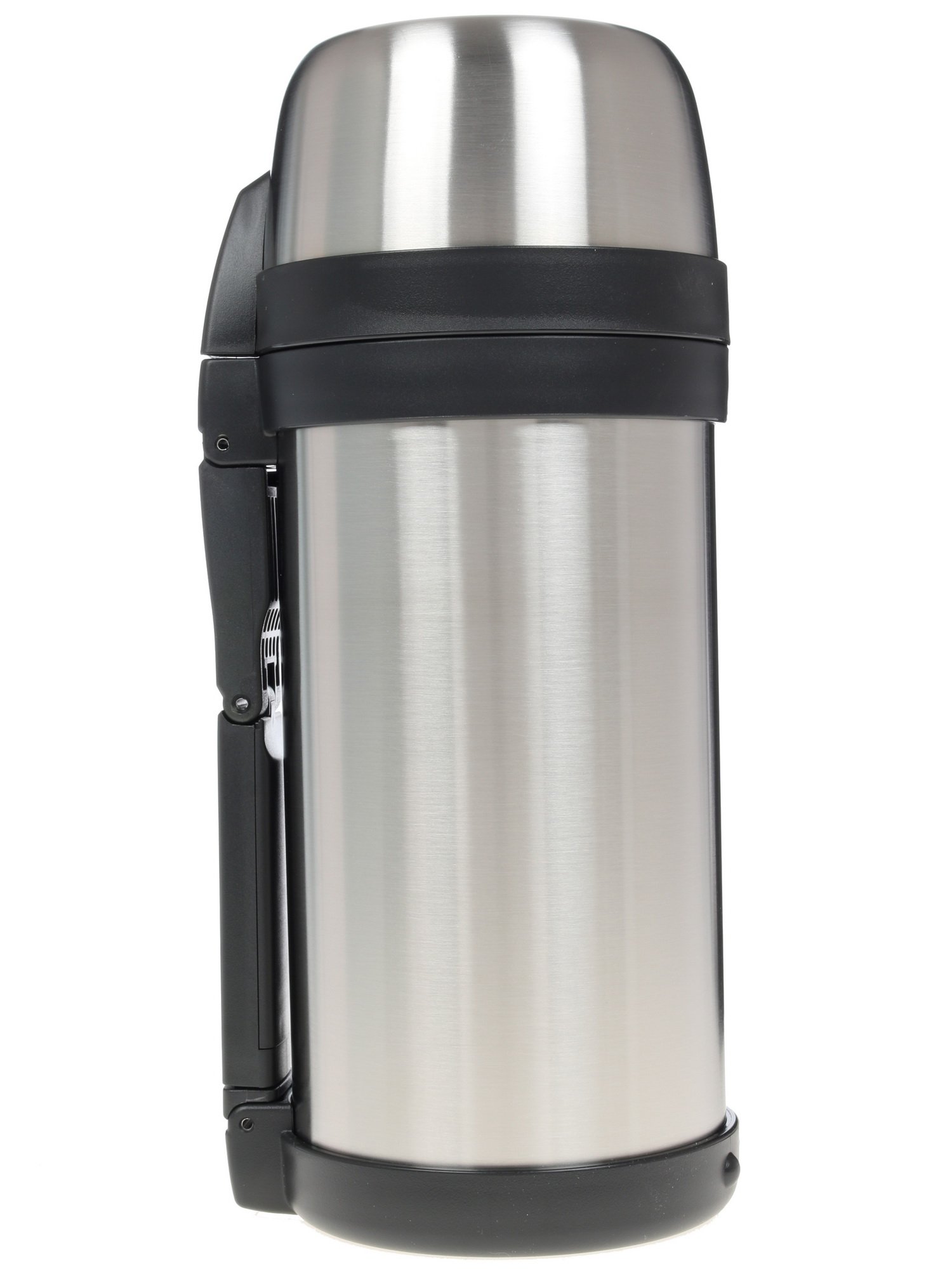 Серебристый термос Thermos FDH-1650 SBK объемом 1.65 л с широким горлом подходит для хранения еды и напитков. Он сделан с использованием технологии вакуумной изоляции и сохраняет температуру содержимого не менее 36 ч. Транспортировать термос комфортно благодаря складной ручке и съемному плечевому ремню.