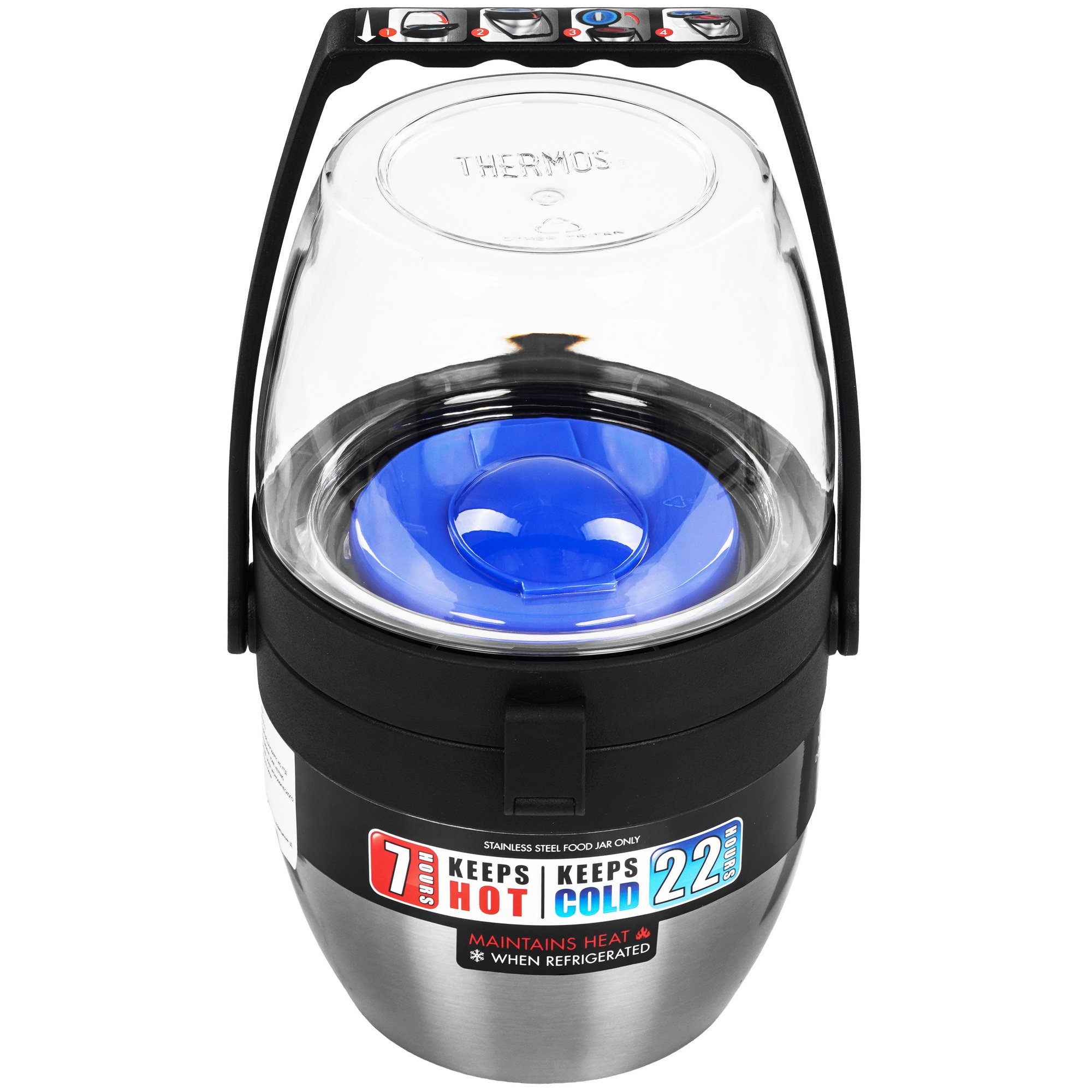 В изотермическом контейнере первые или вторые блюда сохраняются горячими не менее 7 часов или прохладными в течение 12 часов за счёт вакуумной термоизоляции, созданной по уникальной технологии компании-производителя. Пищевая сталь (18/8 AISI 304 Stainless Steel) инертна по отношению к содержимому и не влияет на его вкус, сохраняя еду аппетитной и ароматной. В контейнер из Тритана можно поместить холодные закуски, салаты, овощи, фрукты и т.п. Оба контейнера закрываются герметичными крышками, имеющими поворотные указатели. Винтовая крышка ёмкости с вакуумной изоляцией оснащена клапаном сброса давления для облегчения открывания термоса с горячим содержимым. В комплект входит складная ложка-вилка из пищевой нержавеющей стали, для которой в одной из крышек предусмотрена специальная ниша для хранения. Контейнеры надёжно соединяются между собой боковыми защёлками, а удобство в переноске обеспечивает поворотная эргономичная ручка с рельефом на внутренней стороне. При большом полезном объёме набор имеет достаточно компактные размеры, а его стильный внешний вид дополняет оригинальная форма.