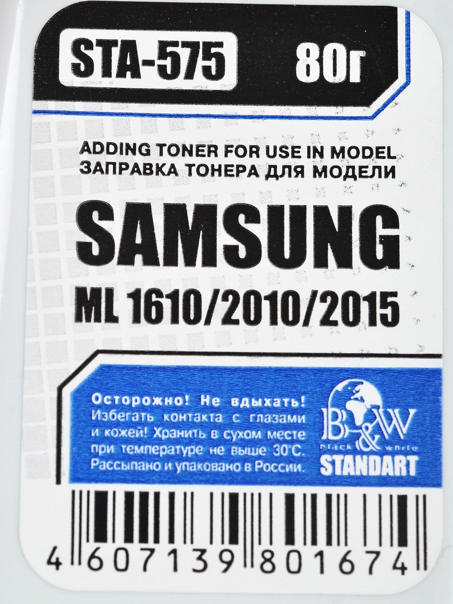 B&W STA-575 представляет собой расходный материал высокого качества, созданный специально для применения с принтерами лазерного типа ML-1610/2010/2015. Использование этого тонера даст возможность пользователю создавать превосходные отпечатки документов исключительного качества. Данный расходный материал позволит значительно повысить эффективность печати и увеличить производительность работы принтера. Кроме того, тонер гарантирует бесперебойную работу Вашего печатного оборудования. B&W STA-575 обладает емкостью 80 грамм, что позволяет осуществить печать приблизительно 3000 страниц в черных цветах.
