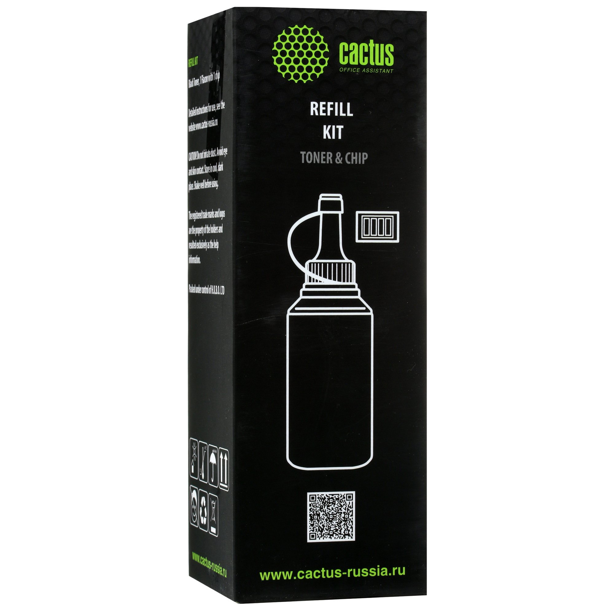 Поставка тонера Cactus CS-RK-TK1200 осуществляется в прочном пластиковом флаконе емкостью 125 г. За счет этого смесь отлично подойдет для нескольких заправок некоторых картриджей. Плотно закручивающаяся крышка обеспечивает герметичность емкости, защищая смесь от влаги и других негативных воздействий и позволяя надежно хранить ее на протяжении длительного времени. Для удобной и быстрой заправки картриджей комплектация тонера включает в себя небольшую воронку и заменяемый электронный чип.