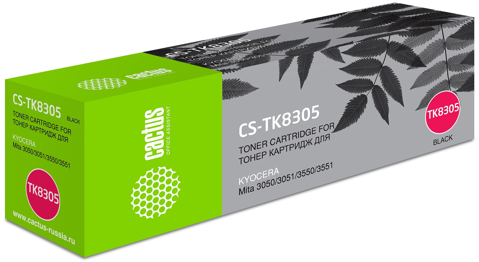 Cactus CS-TK8305 заправлен черной порошковой краской. Тонер оставляет четкий и насыщенный оттиск на бумаге с мгновенным запеканием в печи принтера для устойчивости к стиранию. Устройство со стандартной емкостью обладает рабочим ресурсом в 25000 страниц при условии заполнения листов A4 краской на 5%. Модель дополнена встроенным чипом для контроля за количеством тонера, вывода предупреждения о блокировке и необходимости замены.