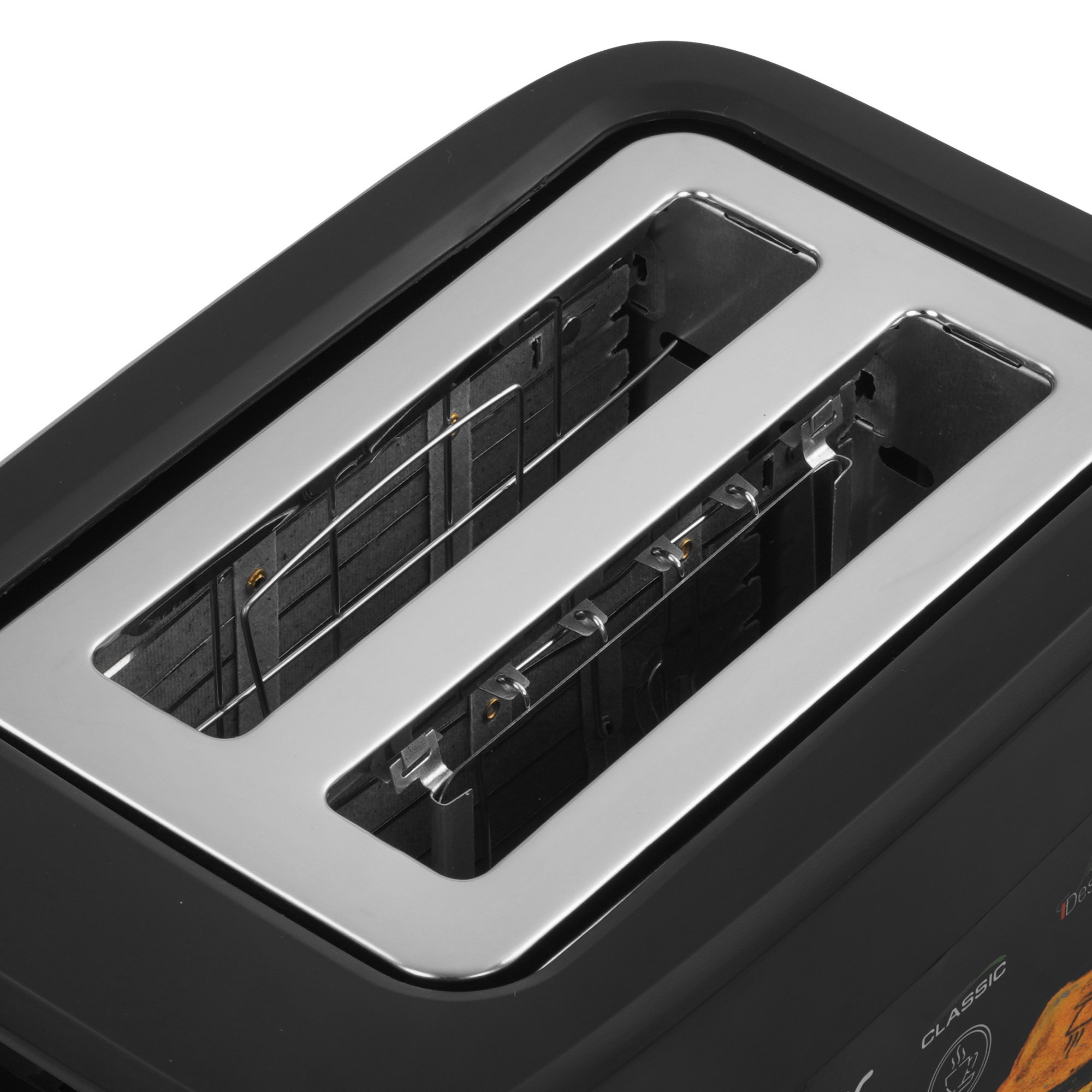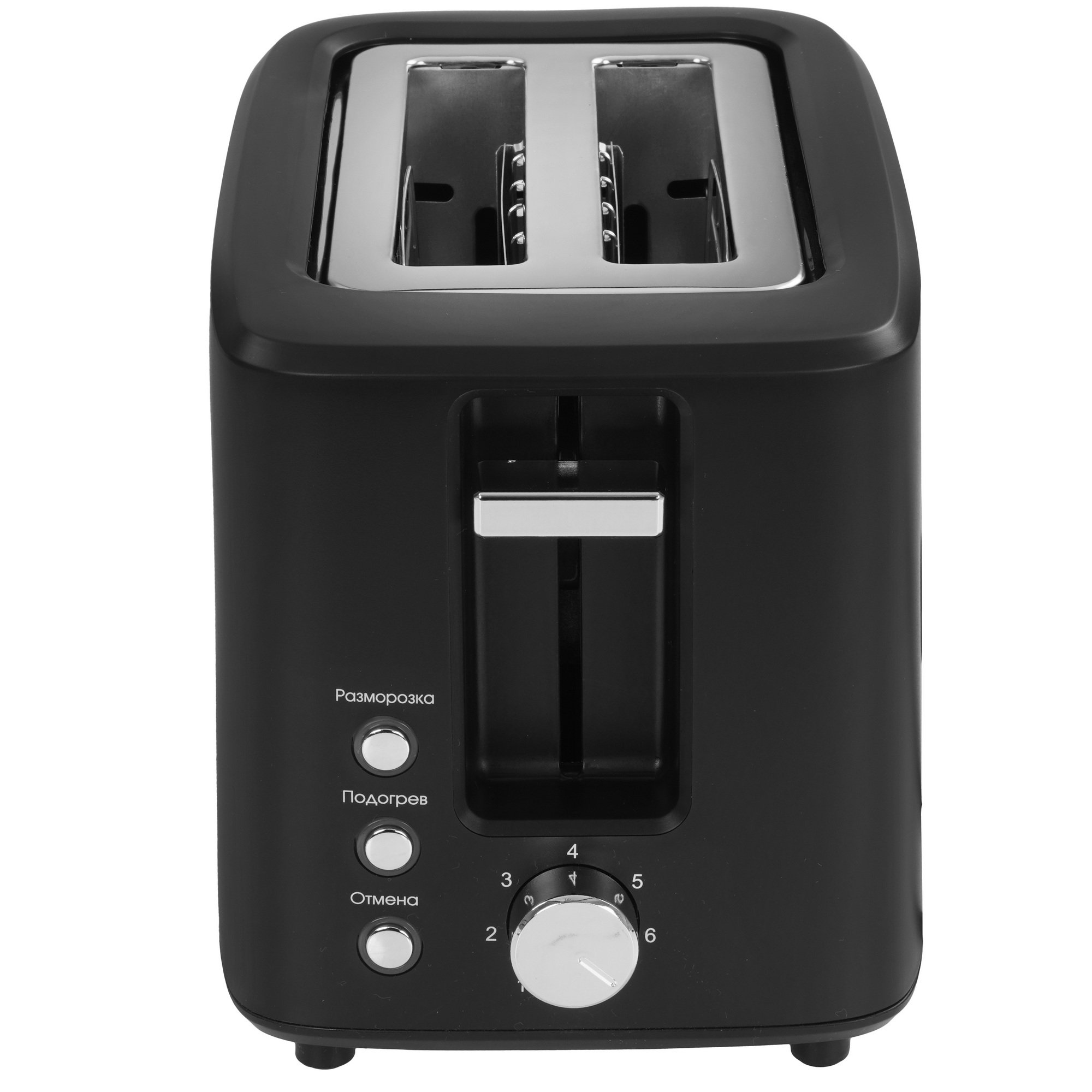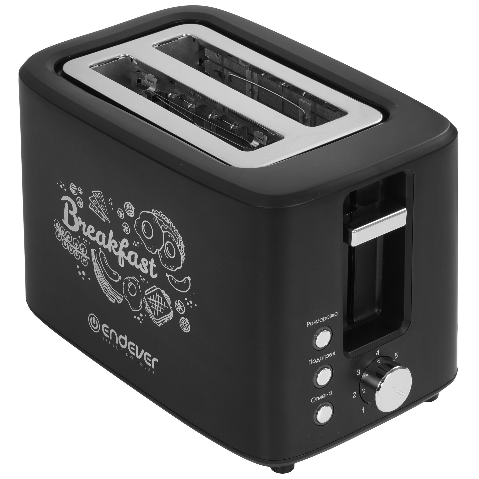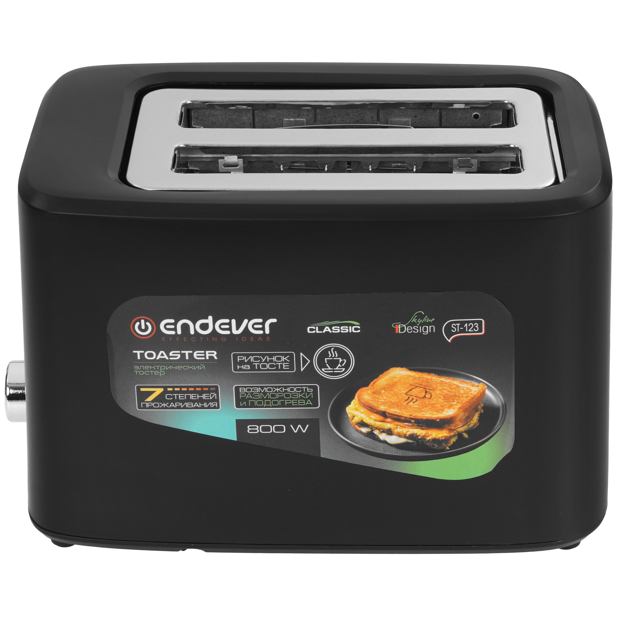 Тостер Endever Skyline ST-123 представлен в черном пластиковом корпусе с принтом и хромированными элементами. Кнопки управления устройством оснащены LED-индикаторами, поэтому их видно в темноте. Прорезиненные ножки надежно фиксируют тостер на столе, предотвращают скольжение и защищают поверхность от царапин.