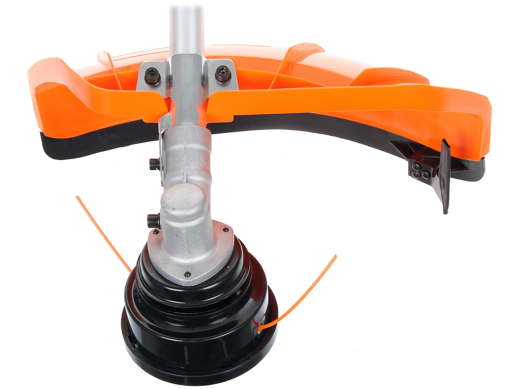 Триммер может осуществлять обработку газона с помощью лески или ножа. 2.4-миллиметровая леска характеризуется рабочей шириной, равной 46 см. Для устранения или подрезки более крупных, чем трава, растений используется 255-миллиметровый нож. В комплектацию триммера, в частности, входят канистра для приготовления топлива, универсальный ключ и шестигранный ключ.