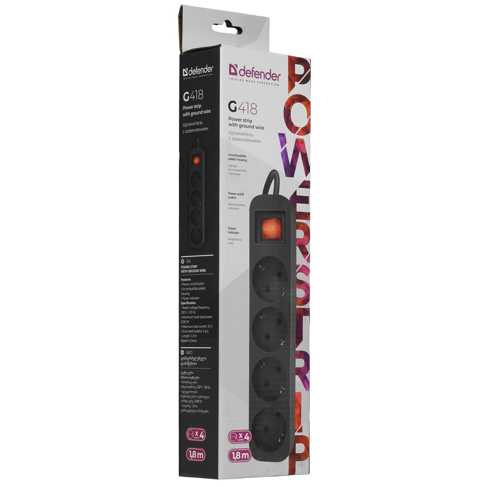 Удлинитель Defender G418 черный, 1.8 м, EURO, 4 розетки, 2200 Вт