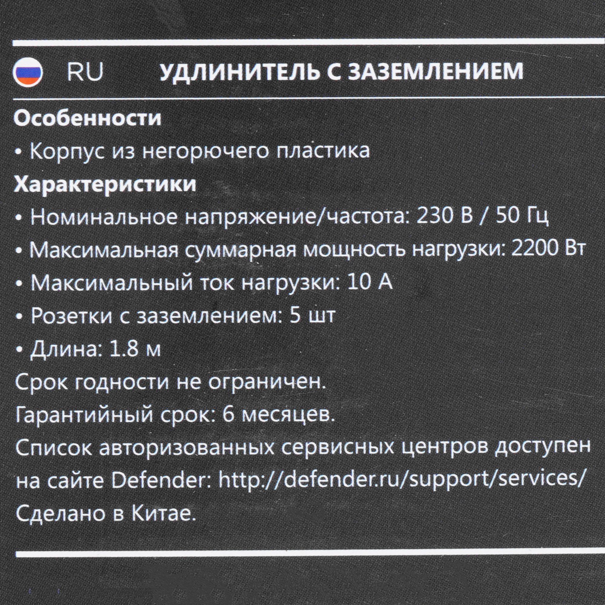 Удлинитель Defender M518 черный имеет 5 евророзеток типа F. Заземление защищает человека от удара током и технику от вывода из строя. Модель выдерживает подключение различных бытовых приборов с общей максимальной мощностью 2.2 кВт, током 10 А и рабочей частотой 50 Гц. Негорючий пластик снижает риск возгорания в случае перегрева или короткого замыкания. ПВС кабель оснащен тремя жилами с сечением 1 мм² каждая. Defender M518 длиной 1.8 м можно применять на улице в теплую погоду и в сухих помещениях.