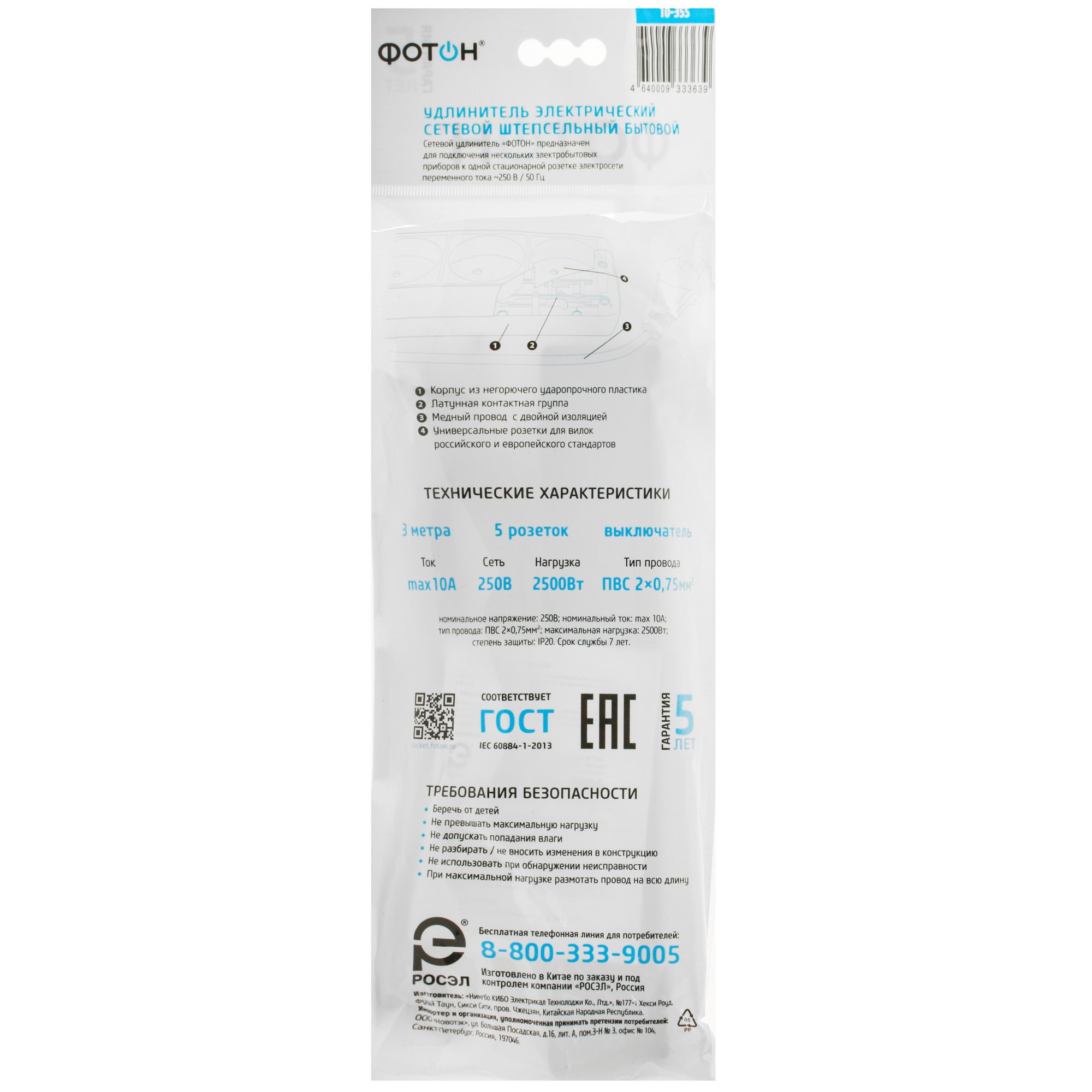 Удлинитель Фотон 10-35S оснащен 5 выходными евророзетками. Для непрерывного функционирования представленной модели потребуется всего-навсего подключить шнур длиной 3 м к сети с номинальным напряжением 250 В. На каждой из розеток расположена защитная шторка, которая не позволит маленьким детям воспользоваться функционалом помощника.