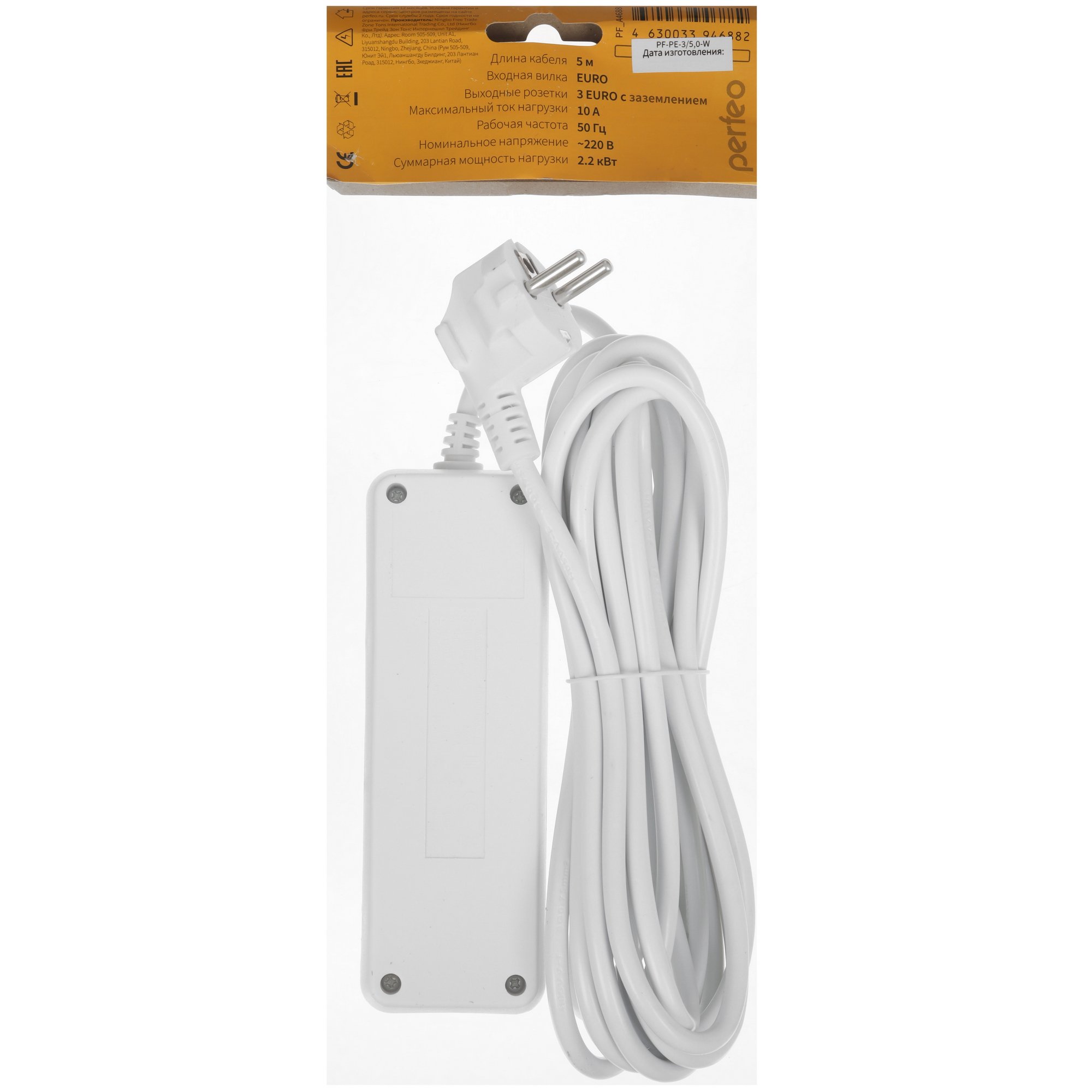 Сетевой удлинитель Perfeo с заземлением "POWERMATE",PF_A4688 (5,0 м, 3 розетки, белый (PF-PE-3/5,0-W))