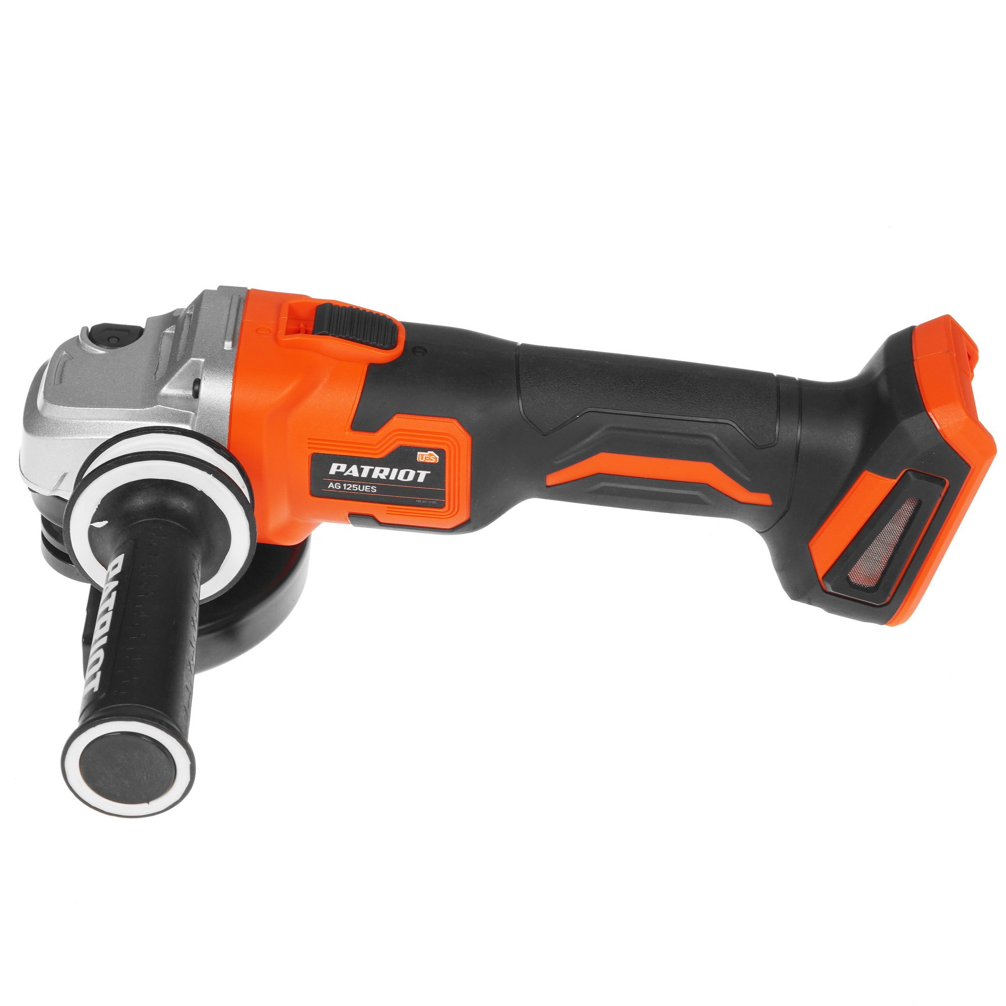 Patriot AG 125UES оснащена двухпозиционной рукояткой, материал которой гарантирует прочный хват без проскальзывания. Система плавного пуска уменьшает нагрузку на шестерни и помогает продлить ресурс службы инструмента. Также отмечаются технологии блокировки шпинделя при заклинивании диска и защиты от перегрузок. Данная модель поставляется без аккумулятора и зарядного устройства.