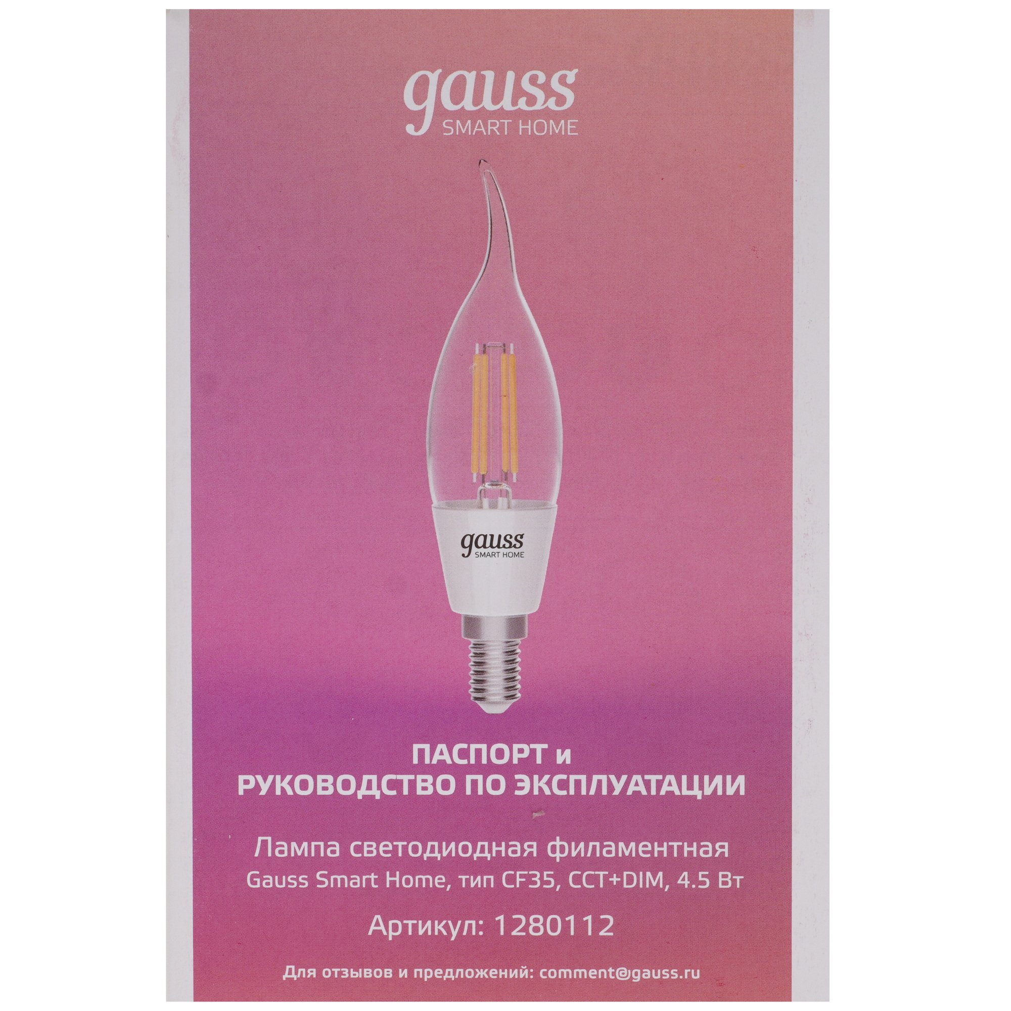 Умная светодиодная лампа Gauss Smart Home Filament СF35 с потребляемой мощностью 4.5 Вт оснащается прозрачным рассеивателем и работает от однофазной бытовой сети. Благодаря минимальному уровню пульсации света лампочка при работе не утомляет глаза пользователя.
