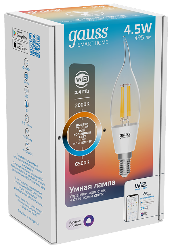 Умная светодиодная лампа Gauss Smart Home Filament СF35 используется для освещения интерьера. Осветительное устройство на основе ярких и долговечных светодиодов оснащается цоколем типа Е14 для подключения к патрону. Лампа в форме свечи на ветру выдает рассеянный белый свет холодного, нейтрального или теплого оттенка с цветовой температурой 2000-6500 К. Ее можно интегрировать в систему умного дома и настроить на выполнение заданных сценариев освещения.