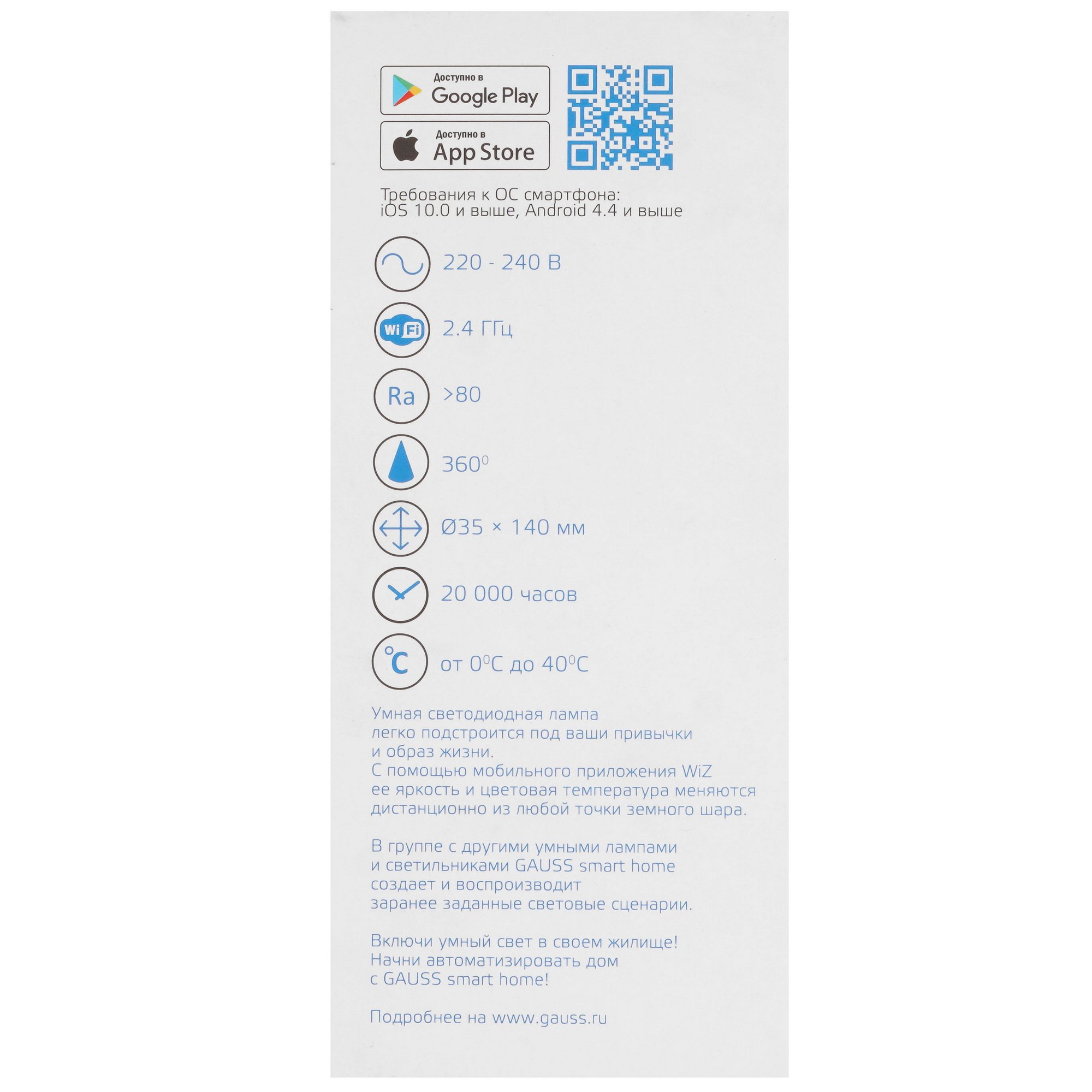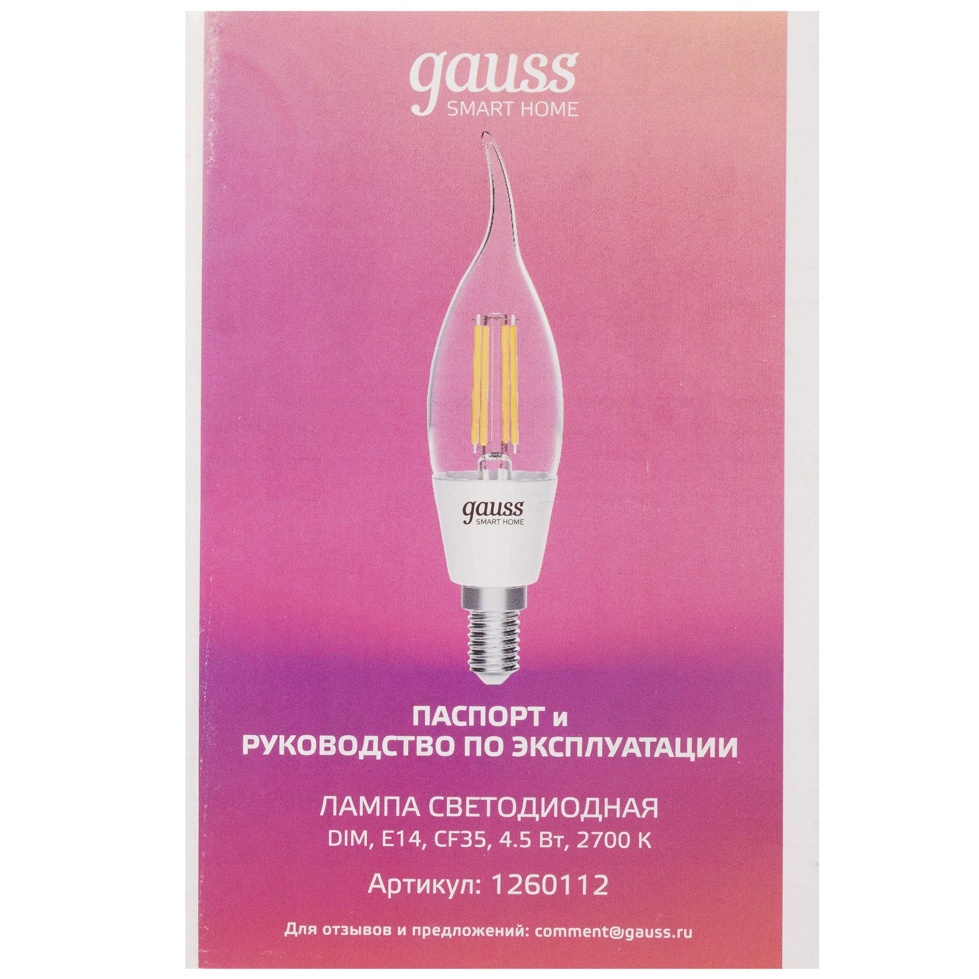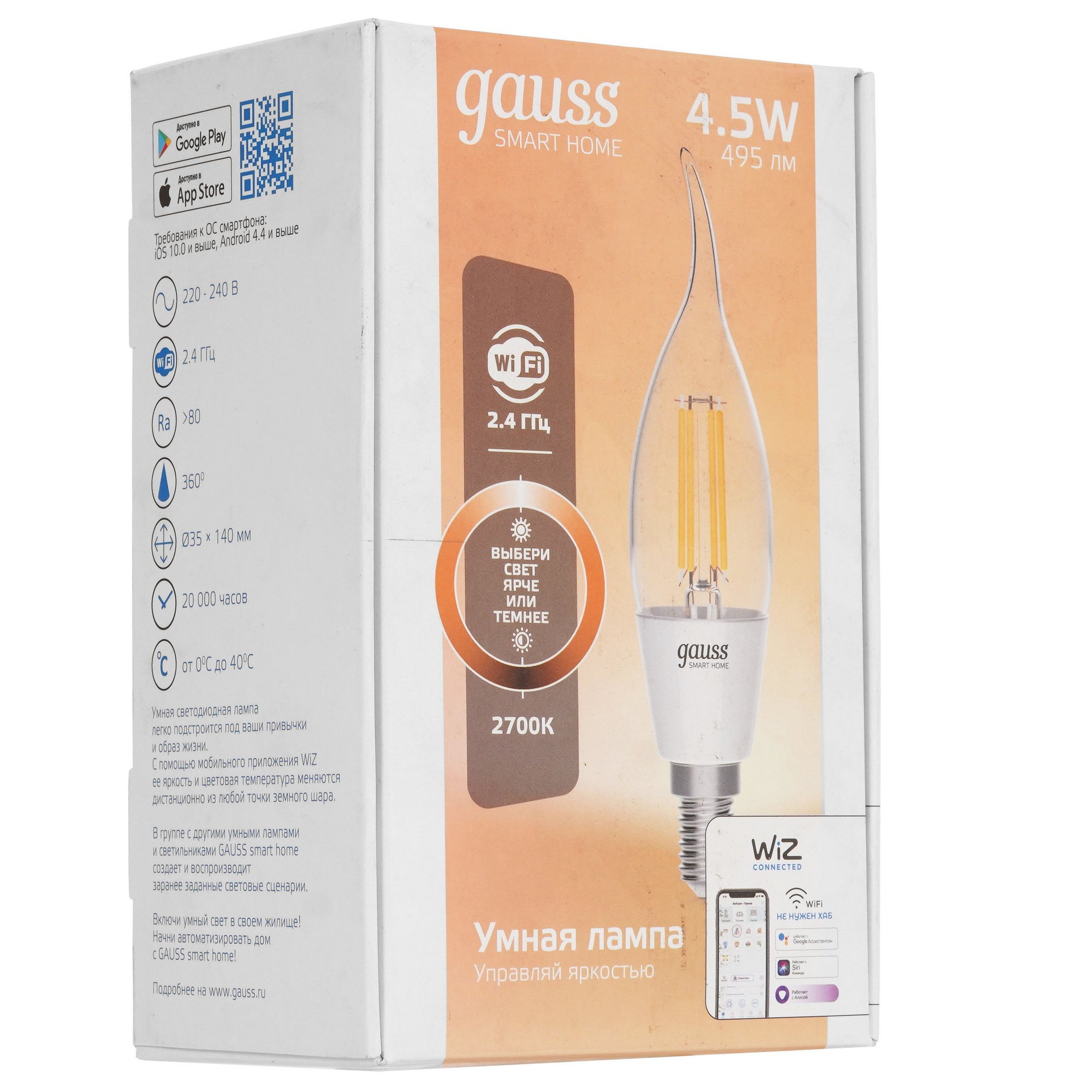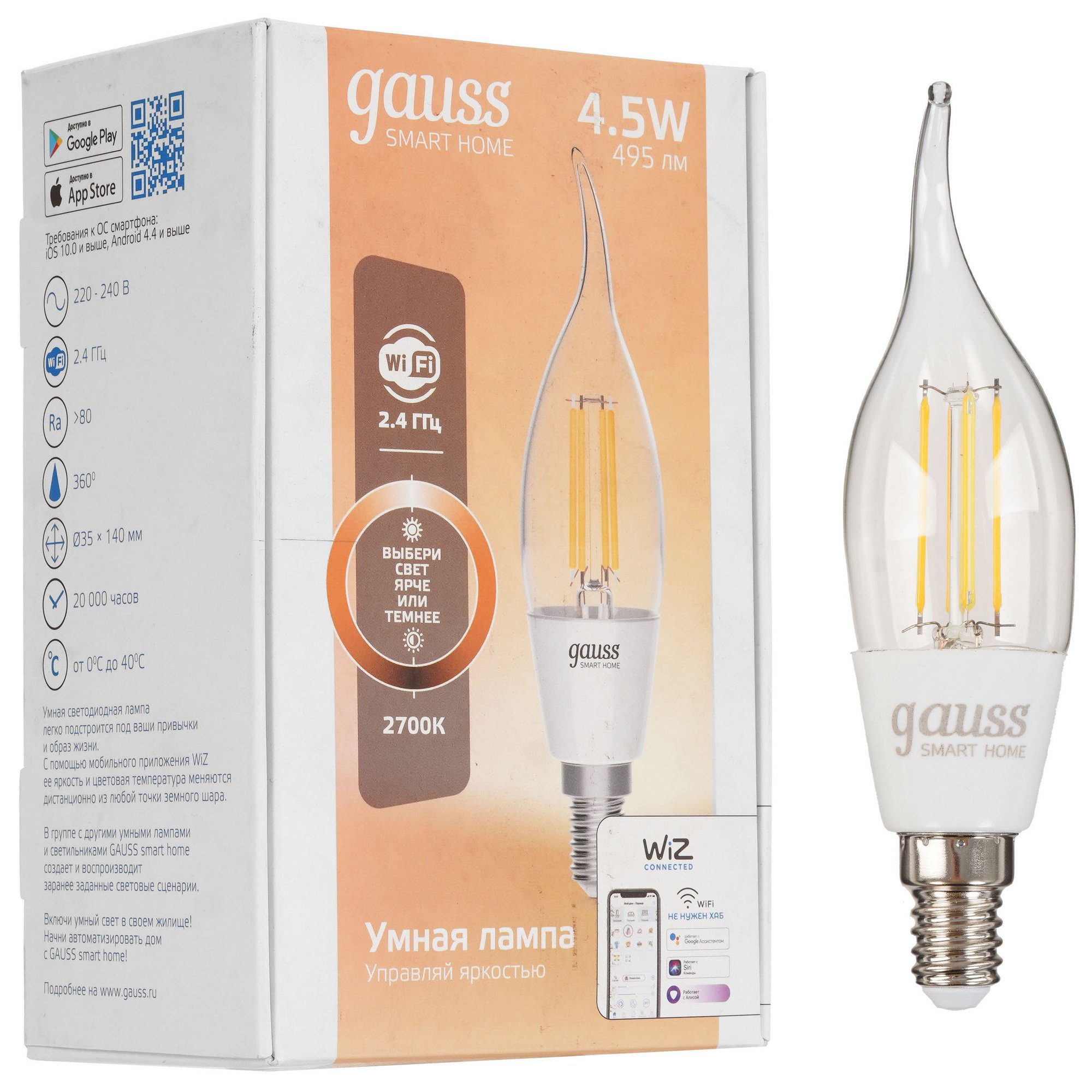 Умная светодиодная лампа Gauss Smart Home Filament СF35 с потребляемой мощностью 4.5 Вт оснащается прозрачным рассеивателем и работает от однофазной бытовой сети. Благодаря минимальному уровню пульсации света лампочка при работе не утомляет глаза пользователя.