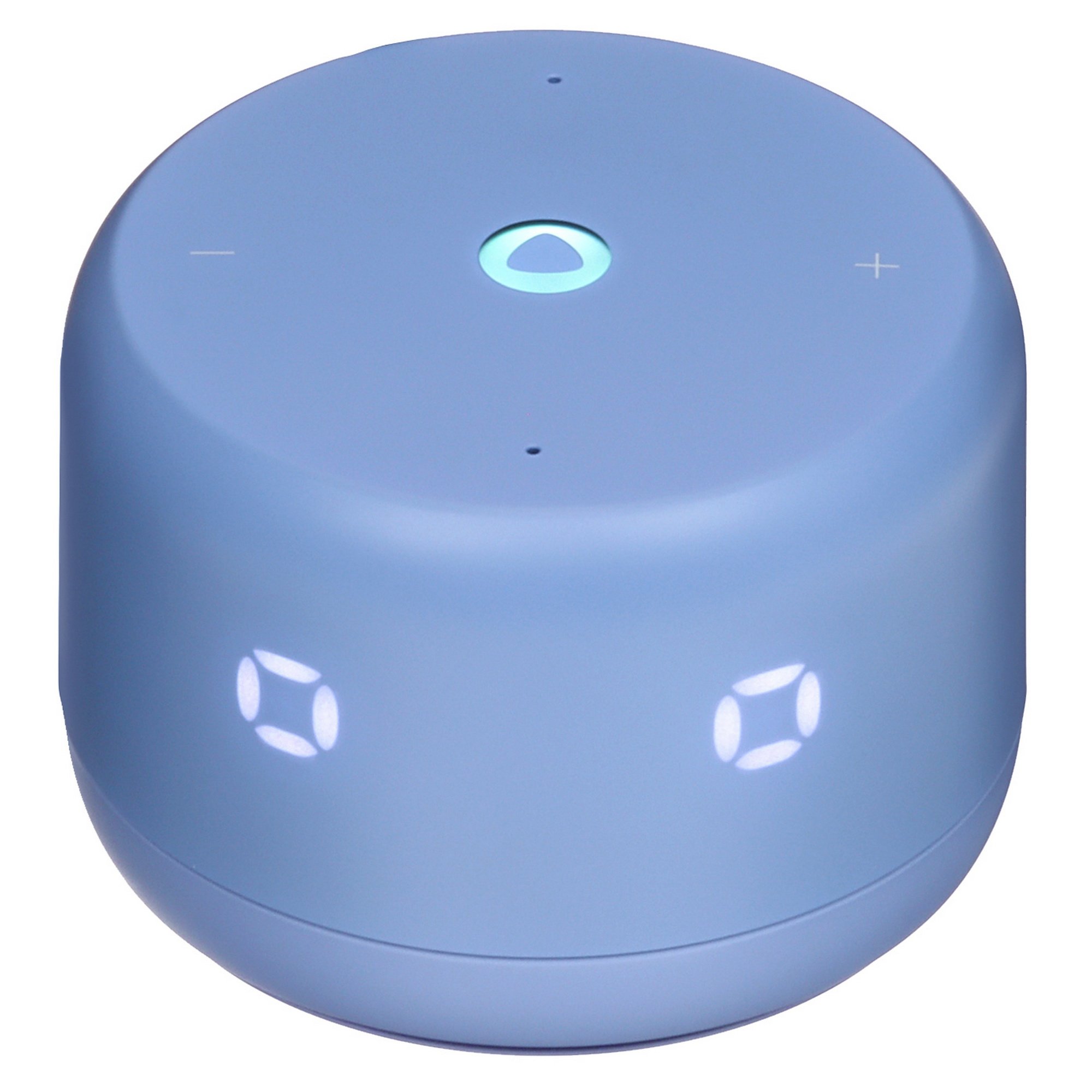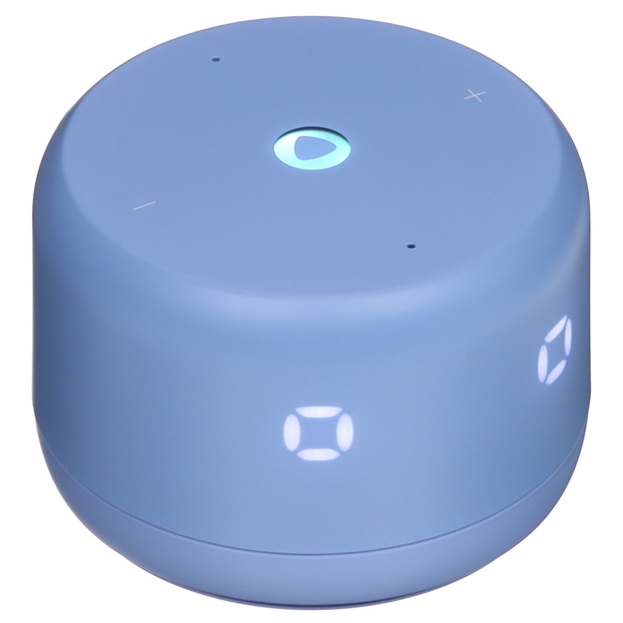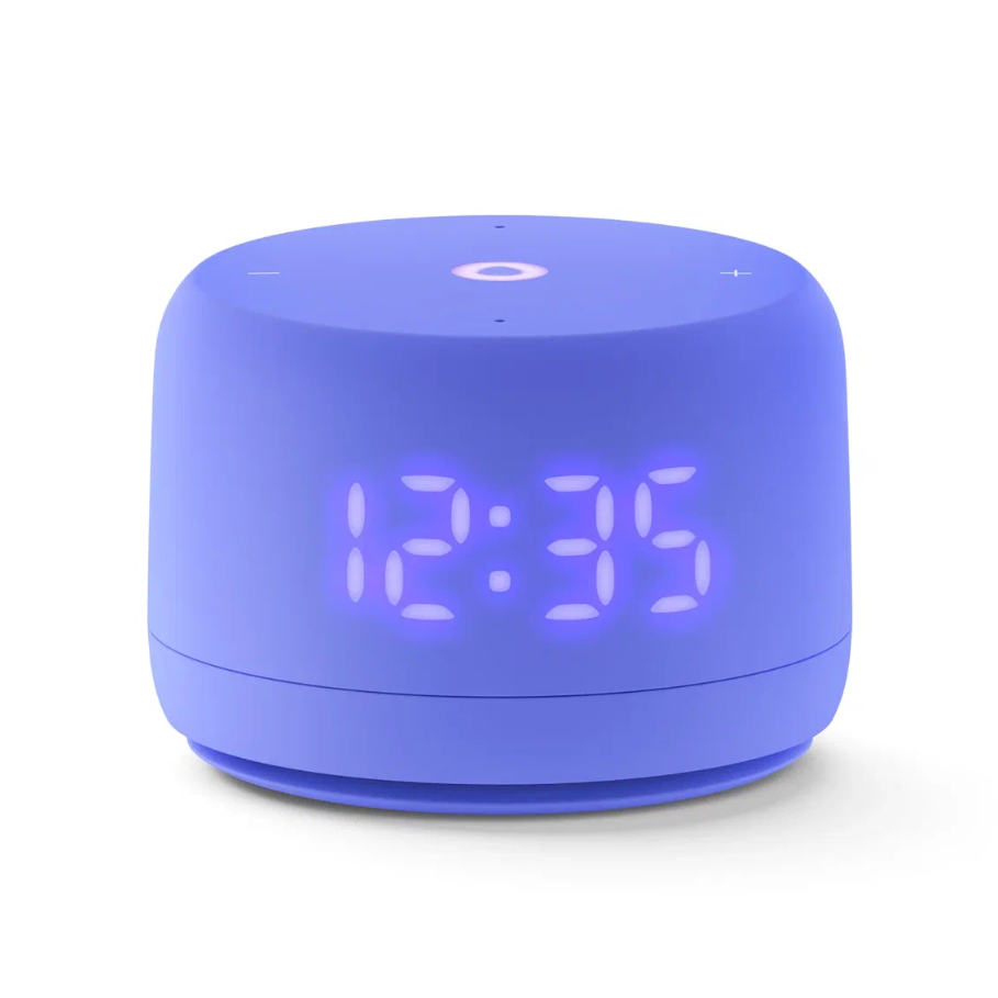 Умная колонка Яндекс Станция Лайт 2 выполнена из пластика с матовым покрытием. Цвет корпуса модели – фиолетовый. Колонка оснащена голосовым помощником Алисой и работает на базе искусственного интеллекта YandexGPT. Спереди на корпусе колонки находится светодиодный экран с часами. Также на нем отображаются эмодзи в виде глазок.