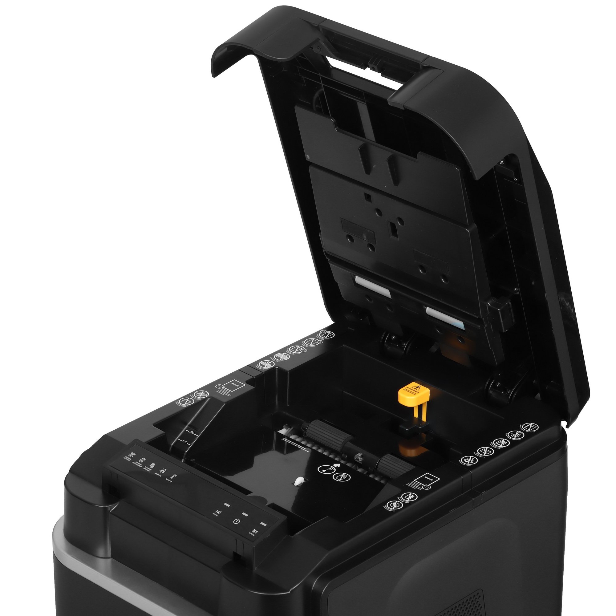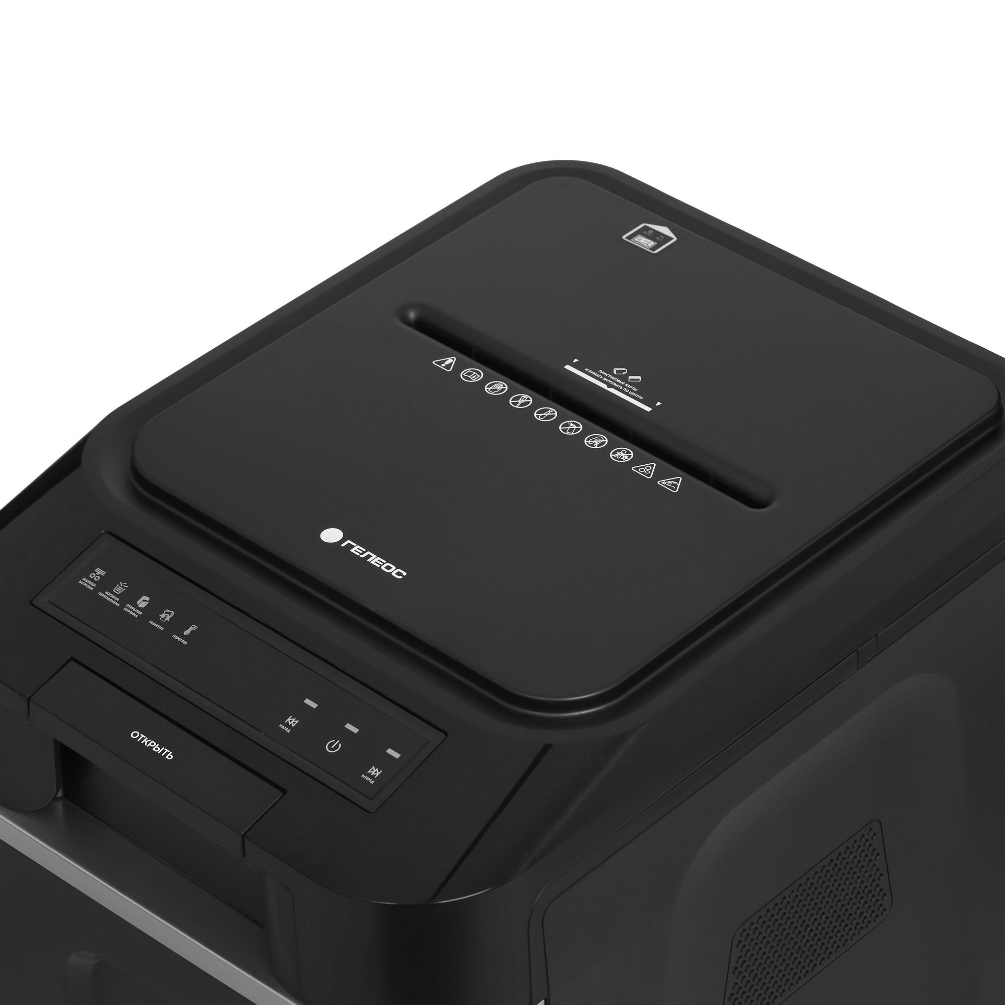 Непрерывная эксплуатация ГЕЛЕОС АП37-4 возможна на протяжении 15 мин. Перерыв между рабочими циклами должен быть не менее 45 мин. Индикаторы сигнализируют о перегреве двигателя и заполненности корзины. Система реверса позволяет вынуть фрагменты, с измельчением которых не справился прибор. Модель уничтожает не только листы бумаги, но также пластиковые карты, скобы, скрепки.