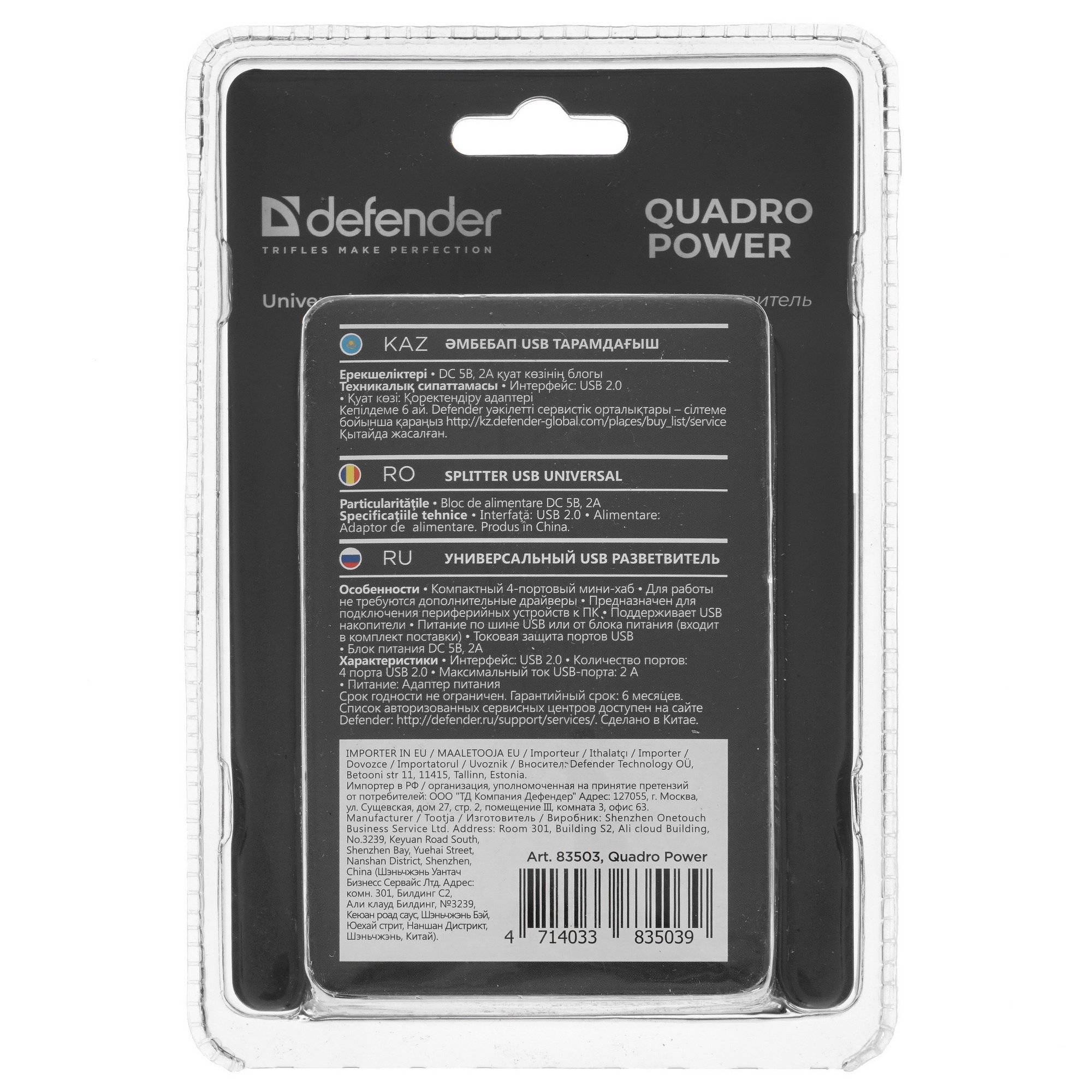 В конструкции USB-разветвителя Defender Quadro Power USB 2.0 присутствует четыре стандартных порта USB 2.0 с токовой защитой для безопасного подключения и стабильной работы устройств. О рабочем состоянии хаба пользователь узнает благодаря светодиодному индикатору. Скорость передачи данных достигает 480 Мбит/сек., чего достаточно для быстрого обмена информацией при подключении внешних накопителей.