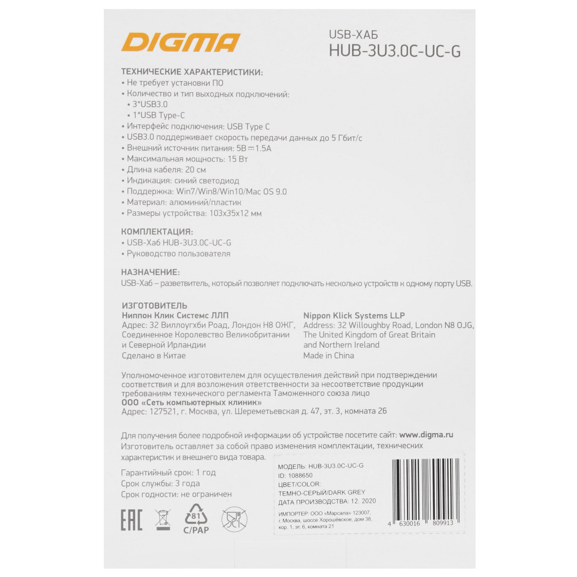 USB-разветвитель Digma HUB-3U3.OC-UC-G необходим, если в вашем компьютере недостаточно USB-портов для подключения всех нужных вам устройств. Или нет разъема Type-C, а устройство нужно подсоединить именно к этому компьютеру. В конструкции предусмотрено 4 разъема, 3 из которых Type-A, и 1 Type-C. Устройство обеспечивает скорость передачи данных до 5 Гбит/сек.