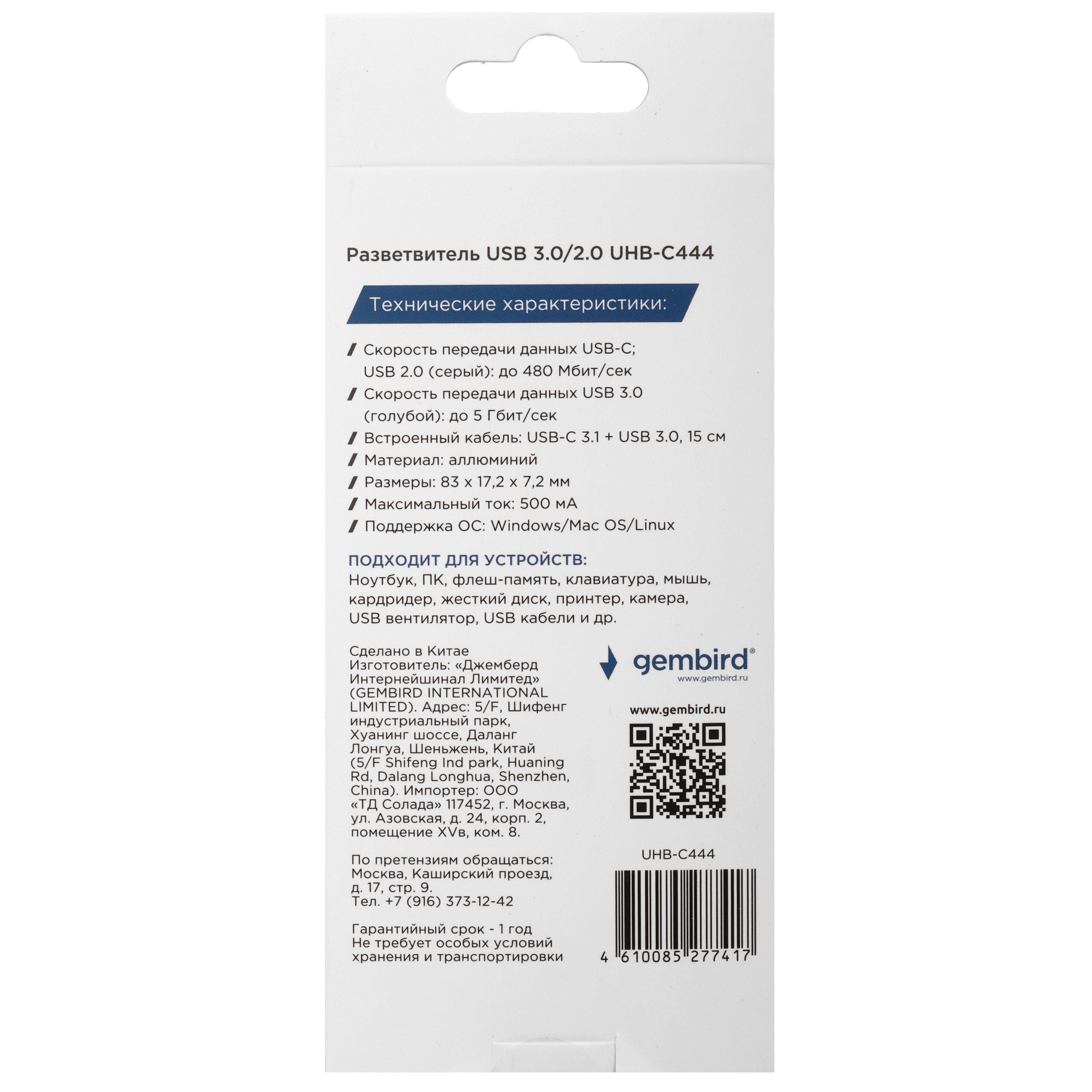 Разветвитель USB 3.0/2.0 Gembird, 4 порта: 2хType-C, 1хUSB 3.0, 1хUSB 2.0, кабель Type-C+USB