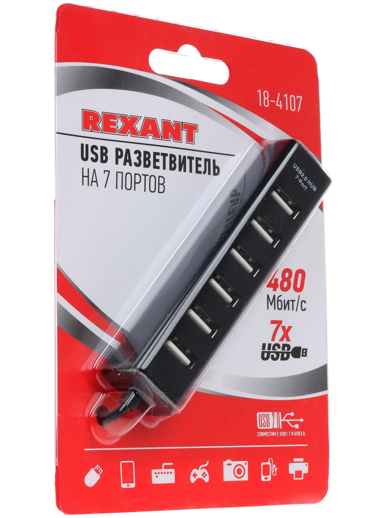 Rexant 18-4107 изготавливается из пластика. Он прочный и защищает внутренние компоненты. Устройство подключается в стандартный порт USB. Предоставляется семь разъемов для последующего присоединения накопителей и различного оборудования. Обеспечивается широкий спектр совместимости.