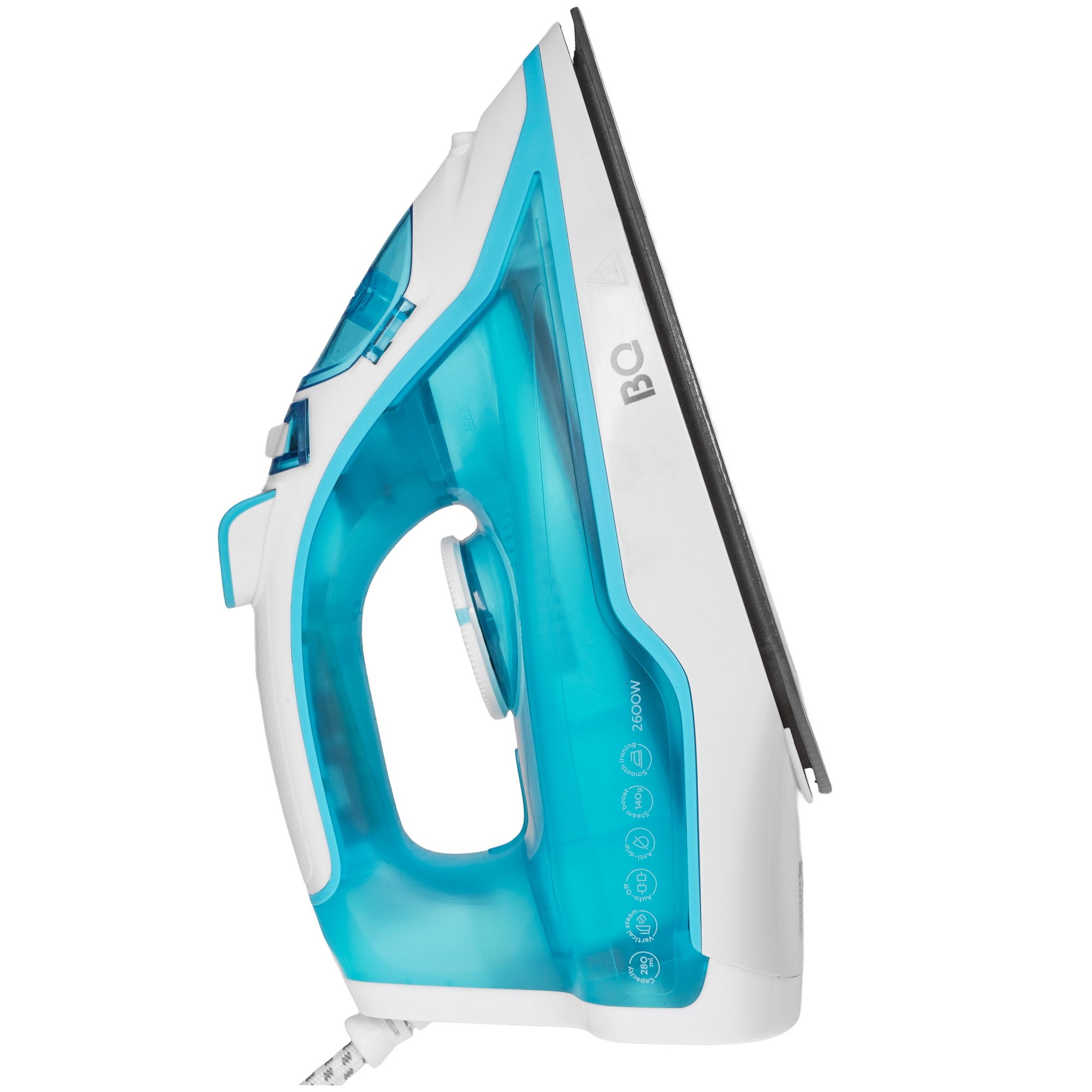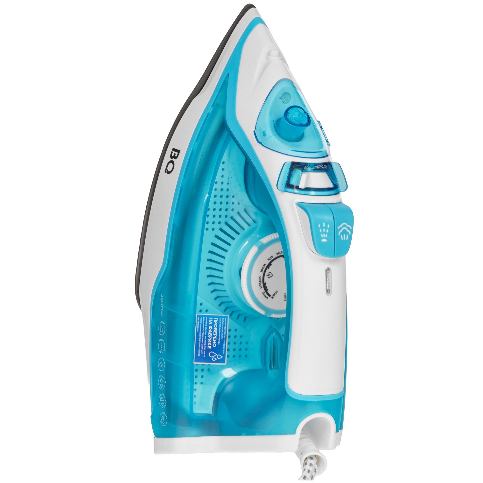 Утюг BQ SI1001 в корпусе синего цвета поддерживает систему автоматической очистки, которая не допускает отложения известкового налета и забивания желобков на подошве. Механический переключатель служит для регулировки температуры, а также интенсивности пара. Функция сухого глаженья предупреждает появление подтеков на деликатных и подкладочных материалах. При нахождении прибора в горизонтальном положении на протяжении 30 сек срабатывает система автоматического отключения.