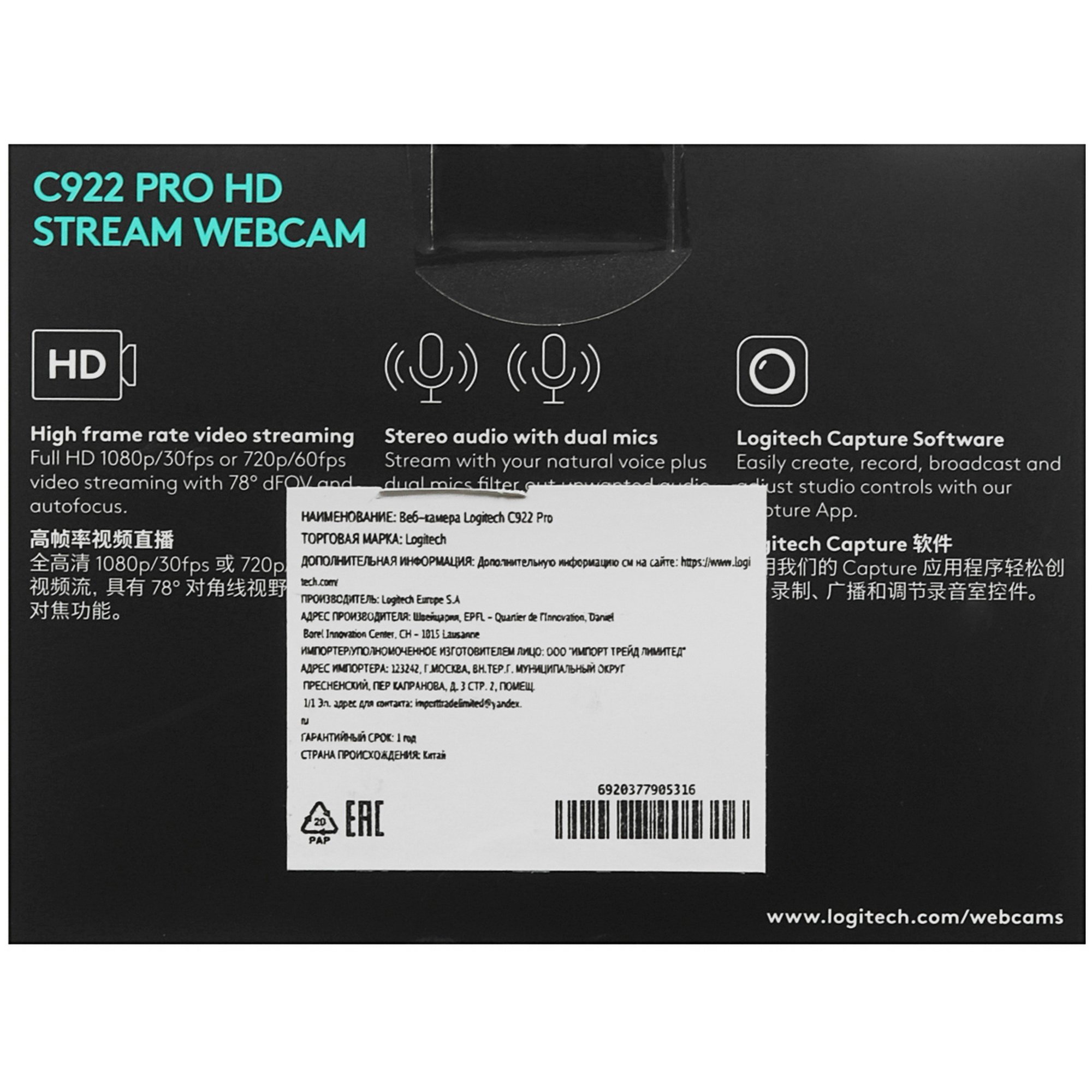 Веб-камера Logitech C922 Pro Stream подходит для видеоконференций и трансляций в режиме реального времени. Матрица CMOS с разрешением 2 Мп и объектив с углом обзора 78° обеспечивают детализированное видео формата FullHD с частотой 30 кадров в секунду. Система автофокусировки наводит резкость в кадре съемки.