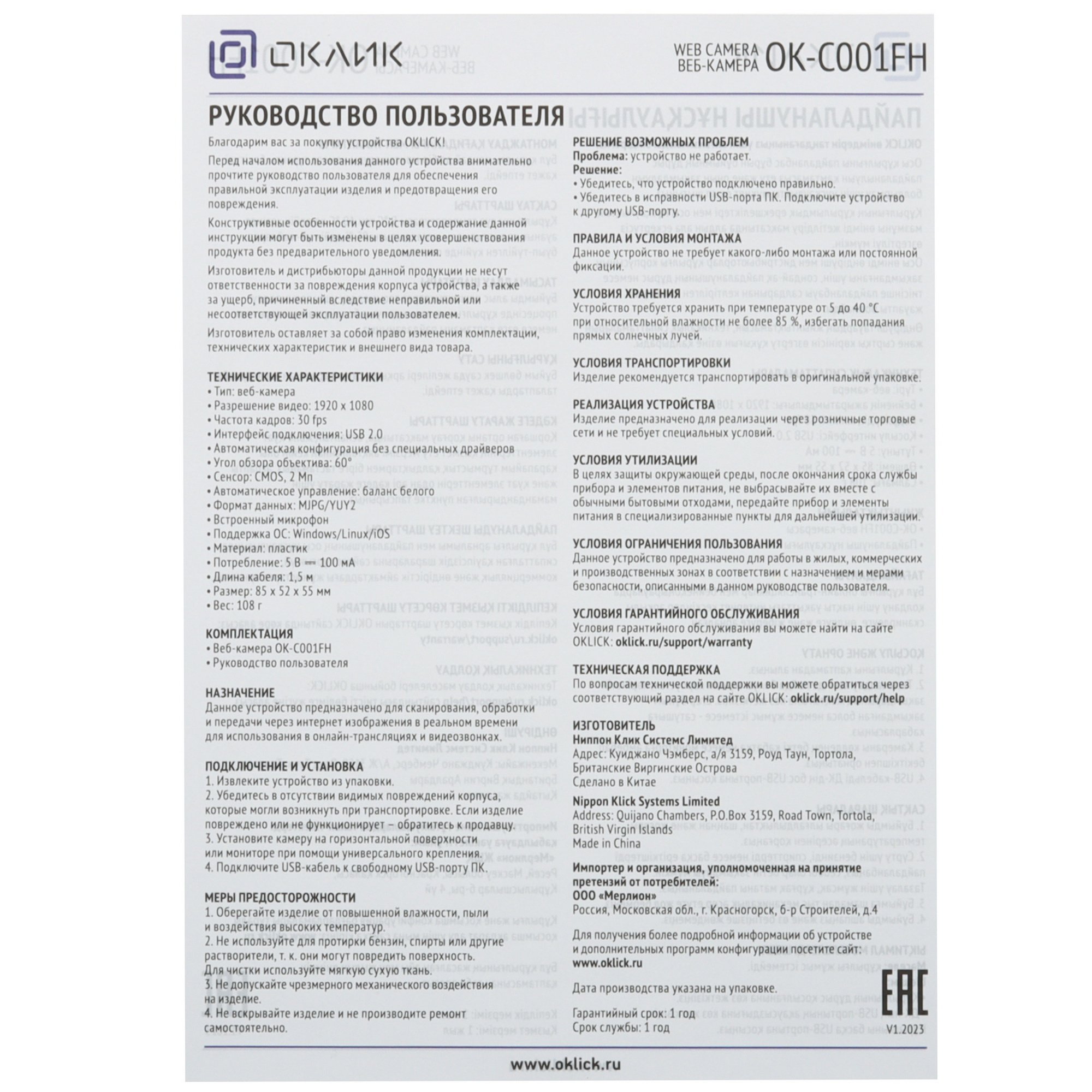 Веб-камера Oklick OK-C001FH на основе CMOS-матрицы обладает разрешением 2 Мп, возможностью фиксированной фокусировки и балансировки белого. При этом частота обновления кадров составляет 30 в секунду, а угол обзора – 60 градусов. Для удобства общения веб-камера дополнена микрофоном. Подключение осуществляется за счет кабеля длиной 1.5 м. Предусмотрено также универсальное крепление для размещения Oklick OK-C001FH на мониторе. Шторка позволит пользователю обеспечить себе чувство приватности. Корпус устройства выполнен из пластика.