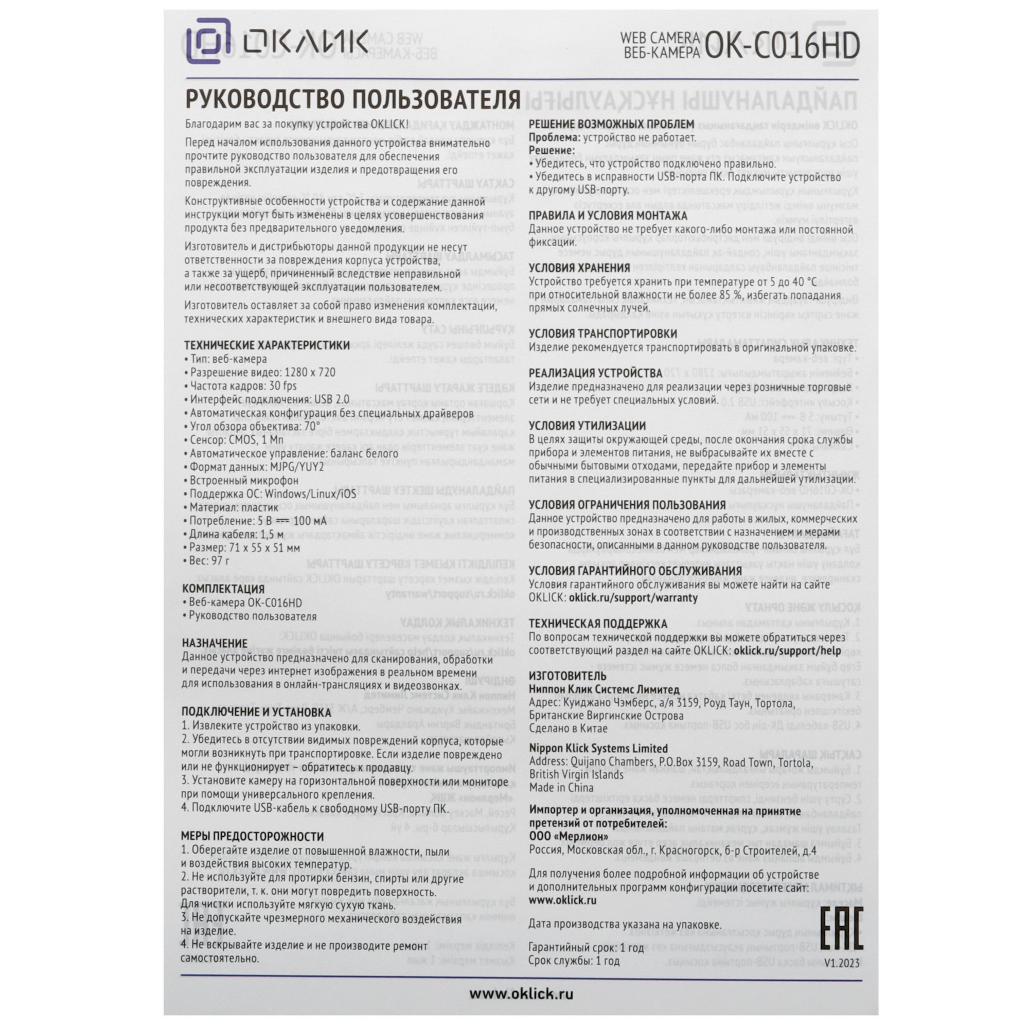 Веб-камера Oklick OK-C016HD обладает матрицей CMOS с разрешением 1280x720 пикс. и фиксированной фокусировкой. Угол обзора модели составляет 70 градусов: ее объектив подходит для захвата объектов, расположенных перед ней на расстоянии до 10 м. Также у устройства есть встроенный микрофон с чистым звучанием для удобства общения. Проводное подключение осуществляется за счет кабеля длиной 1.5 м.