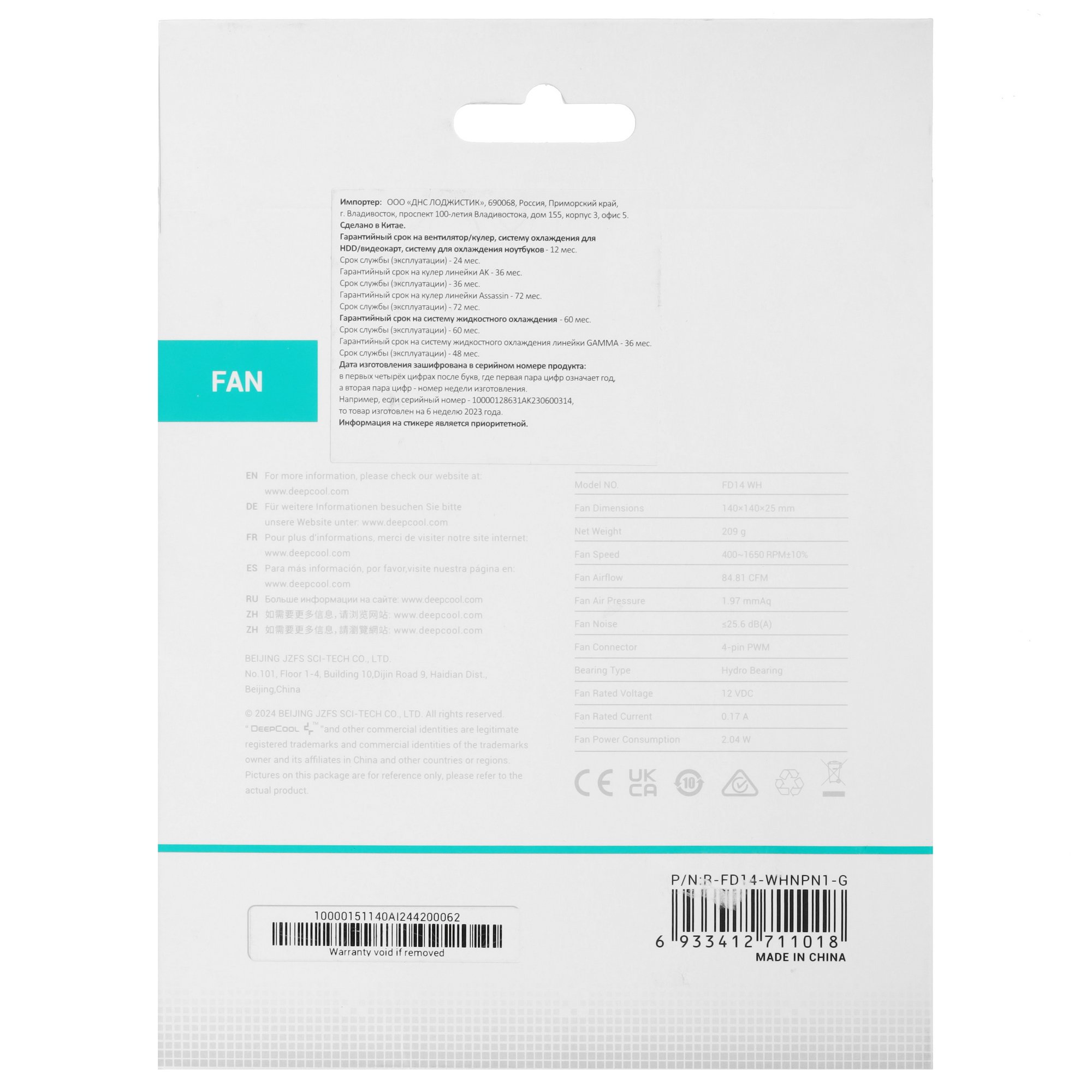 Вентилятор для корпуса DEEPCOOL FD14 белый, 140 мм, 1650 об/мин, 25.6 дБ, 4 pin