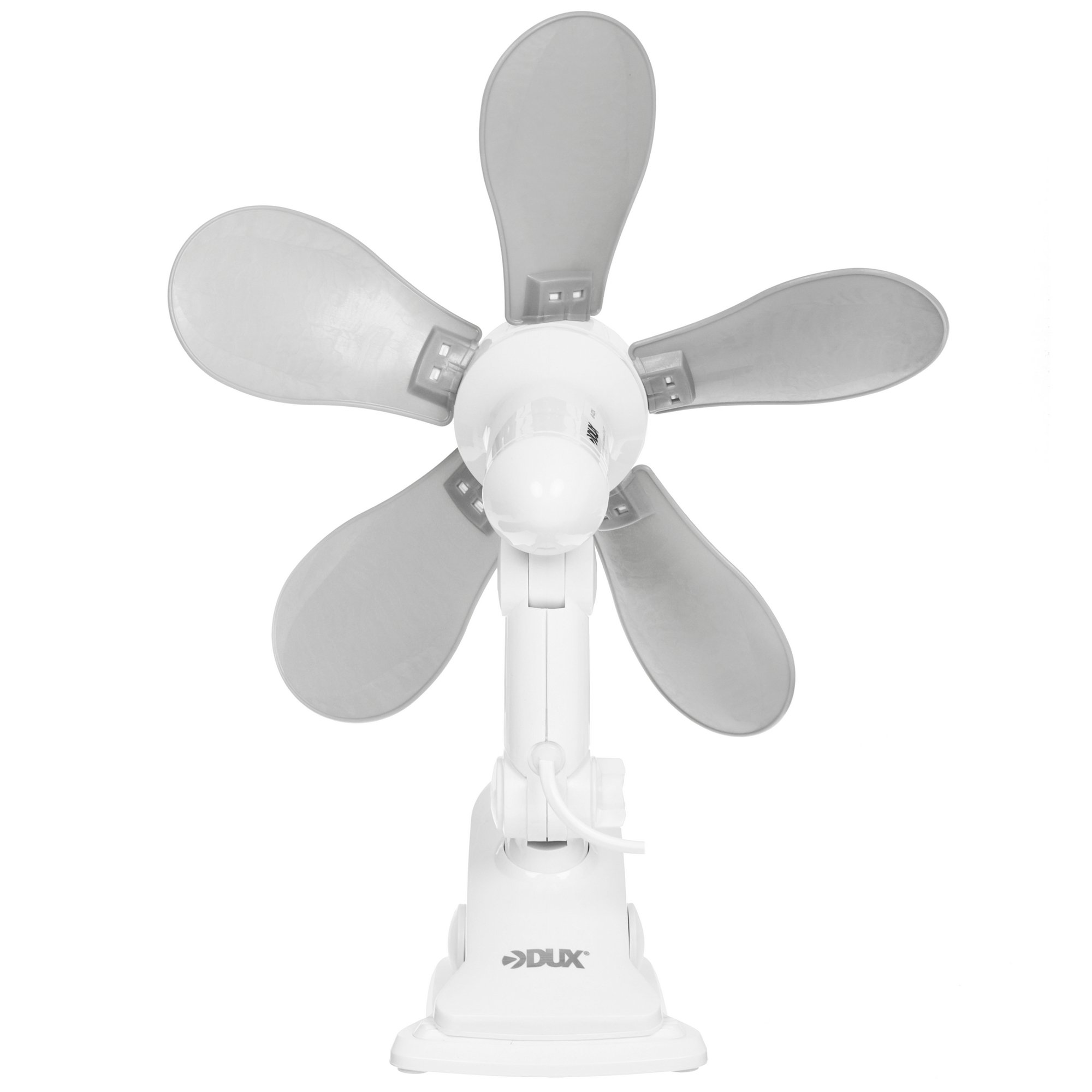 Настольный вентилятор DUX DX-07 – это простой в управлении прибор, позволяющий создать комфортный микроклимат в помещении даже в самый жаркий день. Вентилятор оснащен многофункциональной подставкой, с помощью которой можно расположить прибор на столе, закрепить его на краю стола, а также повесить на стену. Центральная ось прибора вращается на 360 градусов и сгибается в верхней и нижней точке. 5 лопастей прибора выполнены из мягкой резины, что обеспечивает абсолютную безопасность при соприкосновении с ними.