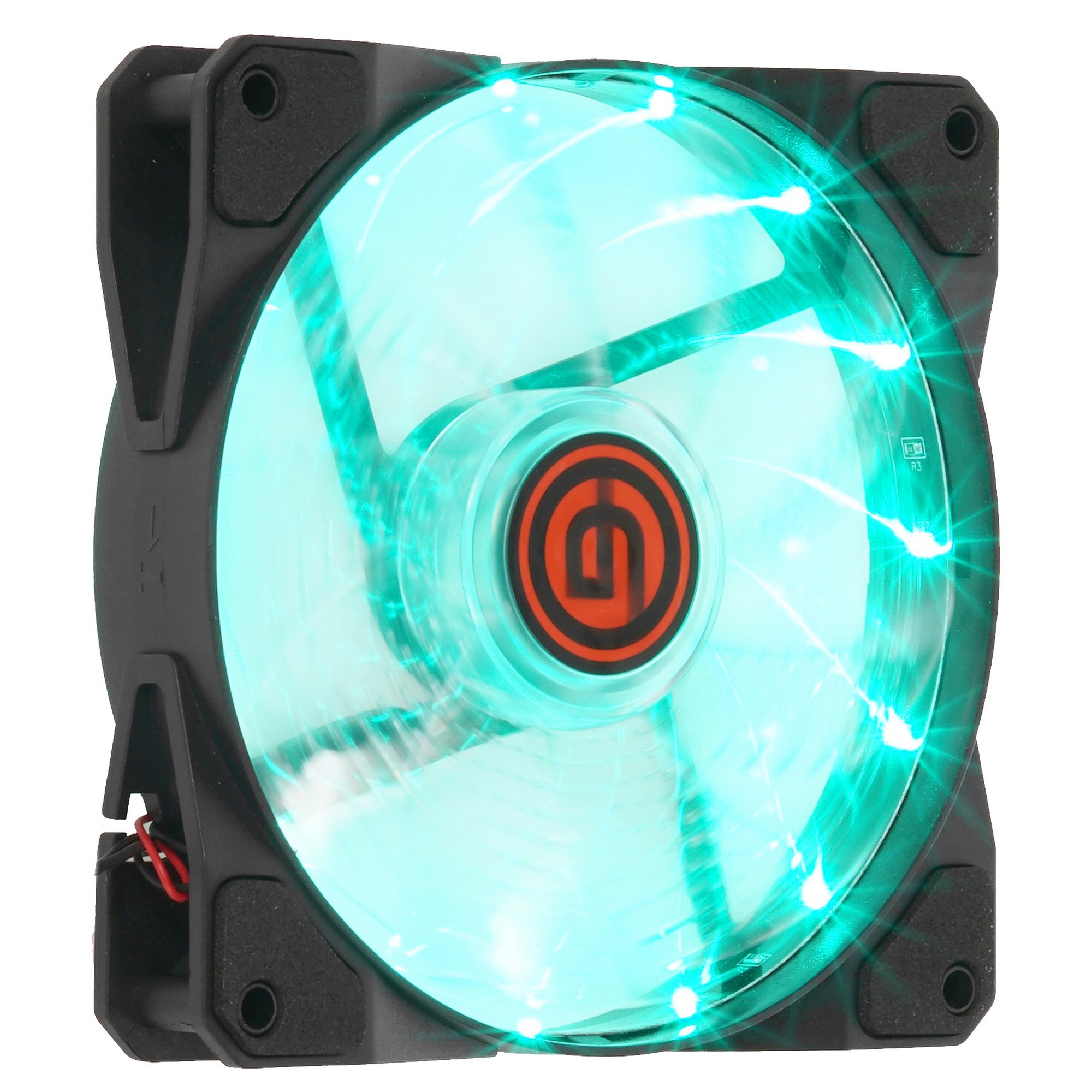 Компактный черный вентилятор GiNZZU LED 12LG15 с белой крыльчаткой обладает размерами 12x12 см. Конструкция оснащена гидродинамическим подшипником и плотной антивибрационной прокладкой, что способствует тихой и безотказной работе. На внутреннем кольце расположено 15 светодиодов, создающих приятное зеленое свечение.