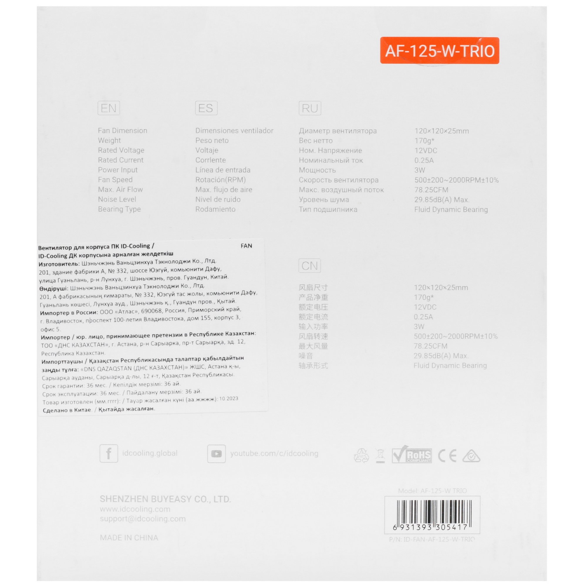 Комплект вентиляторов ID-Cooling AF Series [AF-125-W TRIO] представлен в белом цвете. В набор входят 3 кулера воздушного охлаждения типоразмера 120x120 мм с толщиной корпуса 25 мм. Функция PWM обеспечивает настройку скорости вращения крыльчатки от 500 до 2000 об/мин в автоматическом режиме с учетом нагрузки.