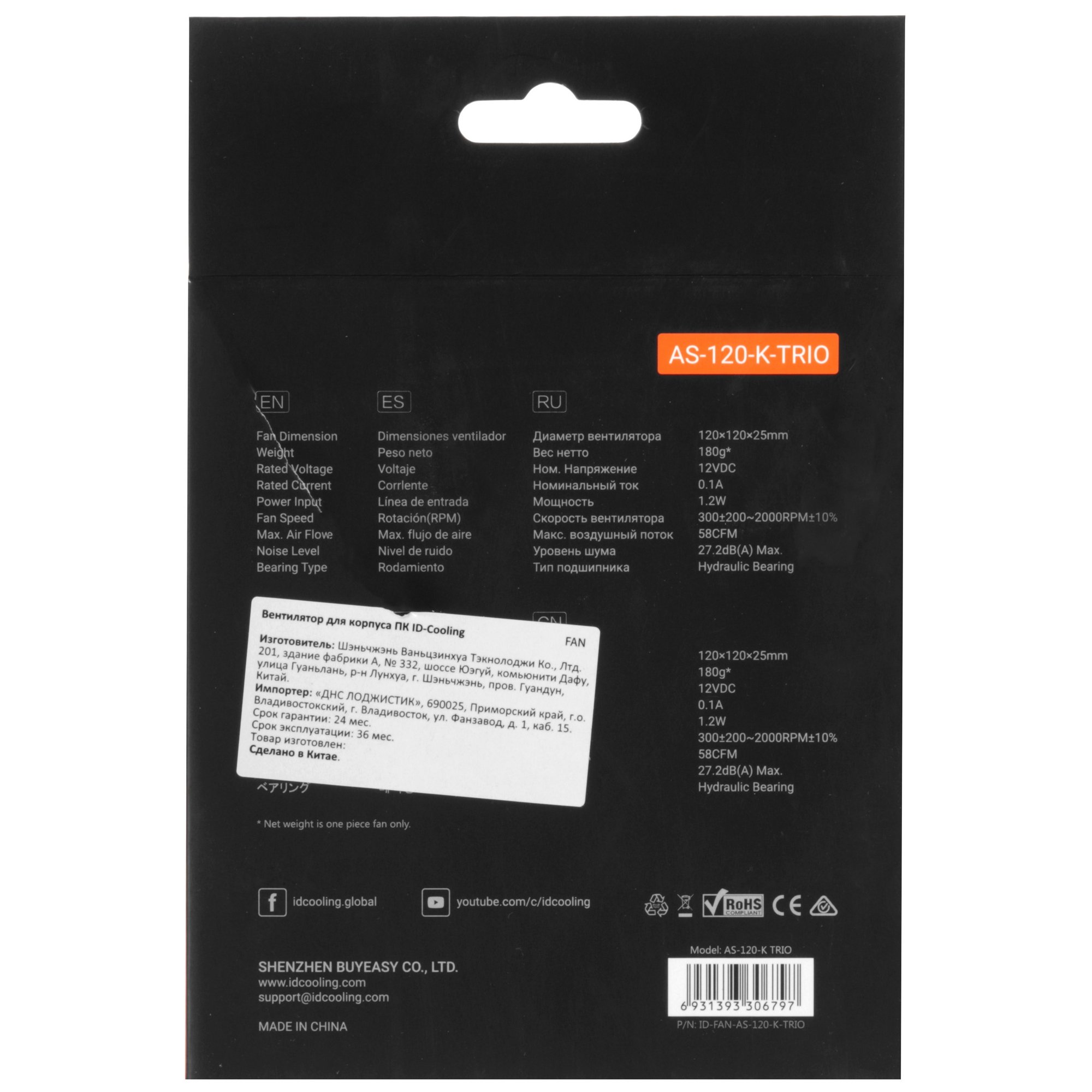 Вентилятор для корпуса ID-Cooling AS-120-K черный, 120 мм, 2000 об/мин, 27.2 дБ, 4 pin