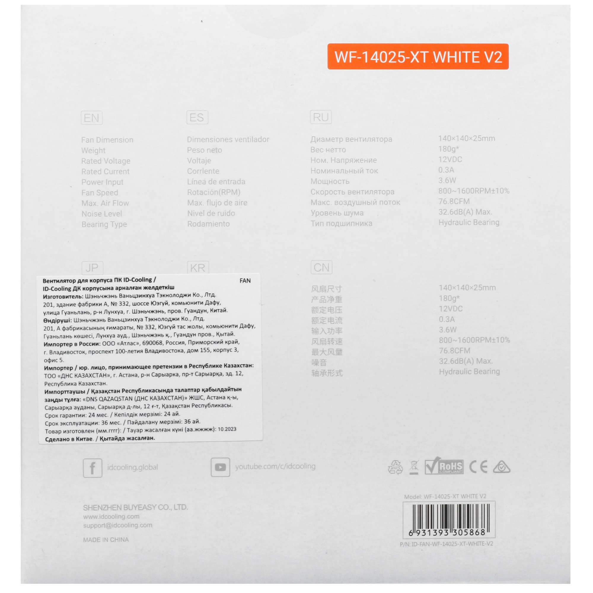 Вентилятор ID-COOLING WF Series [WF-14025-XT WHITE V2] выполнен в корпусе белого цвета. Его размеры составляют 140x140 мм. Лопасти вращаются со скоростью от 800 до 1600 об/мин. Она изменяется автоматически в зависимости от вычислительной нагрузки, что обеспечивает стабильное рассеивание тепла с учетом потребностей.