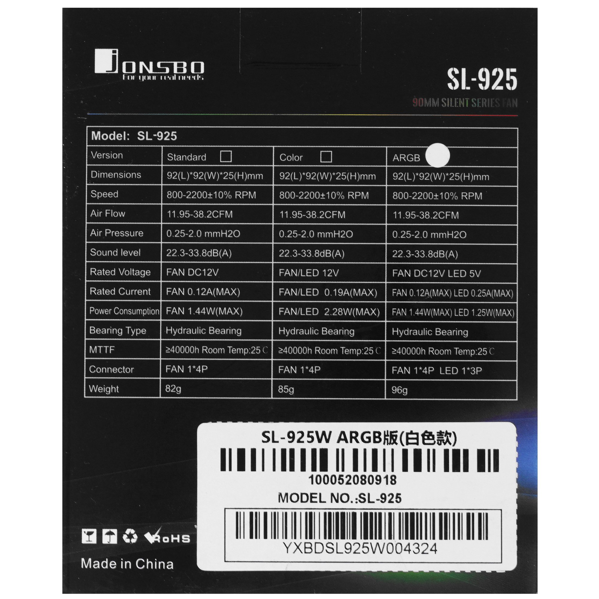 Вентилятор для корпуса JONSBO SL-925W (92x92x25мм, 4-pin PWM, ARGb, 38.2CFM, 33.8dBA, 2200RPM, белый)
