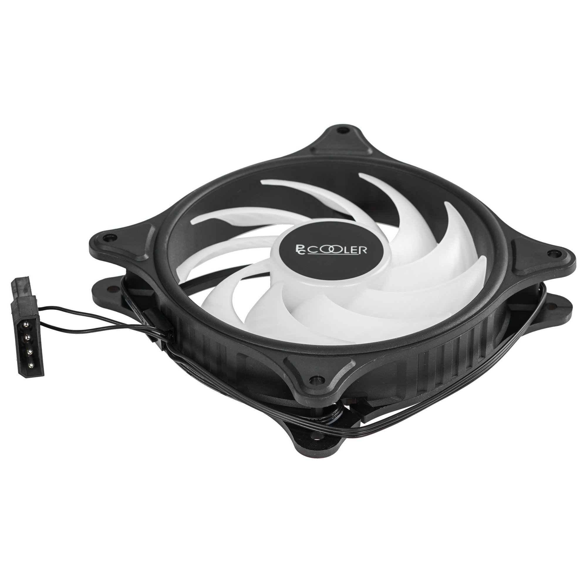 Вентилятор PCCooler FX-120-3 размерами 120x120 мм подключается к плате через разъемы Molex и 3 pin. Модель оснащена 9 лопастями со специальными проекциями. Они вращаются со скоростью 1200 об/мин, создавая ощутимый поток воздуха. Это обеспечивает высокую эффективность охлаждения внутренних компонентов системы. На крыльчатке белого цвета расположены элементы неуправляемой FRGB-подсветки. Цвета в палитре RGB смешиваются, создавая разноцветное свечение.