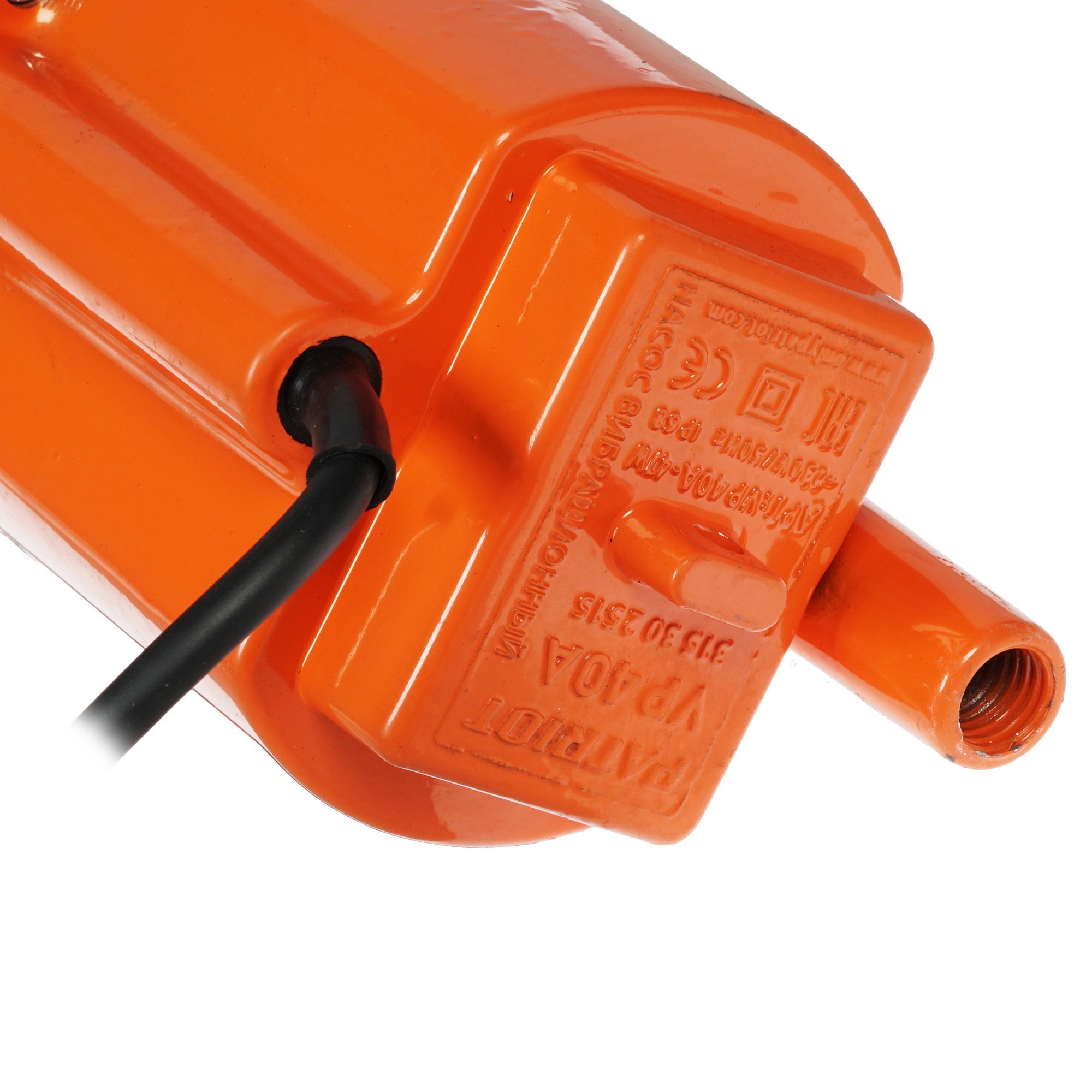 Погружной насос Patriot VP 40А выпускается специально для подъема холодной (с температурой не выше 40 градусов по Цельсию) и чистой воды, нерастворимые включения в которой имеют размер не более 1 мм. Подключение этого электроприбора в корпусе из нержавеющей стали к электросети выполняется за счет кабеля длиной 40 метров. В комплект поставки защищенного от перегрева насоса включены документация, капроновый трос, резиновый поршень, хомут.