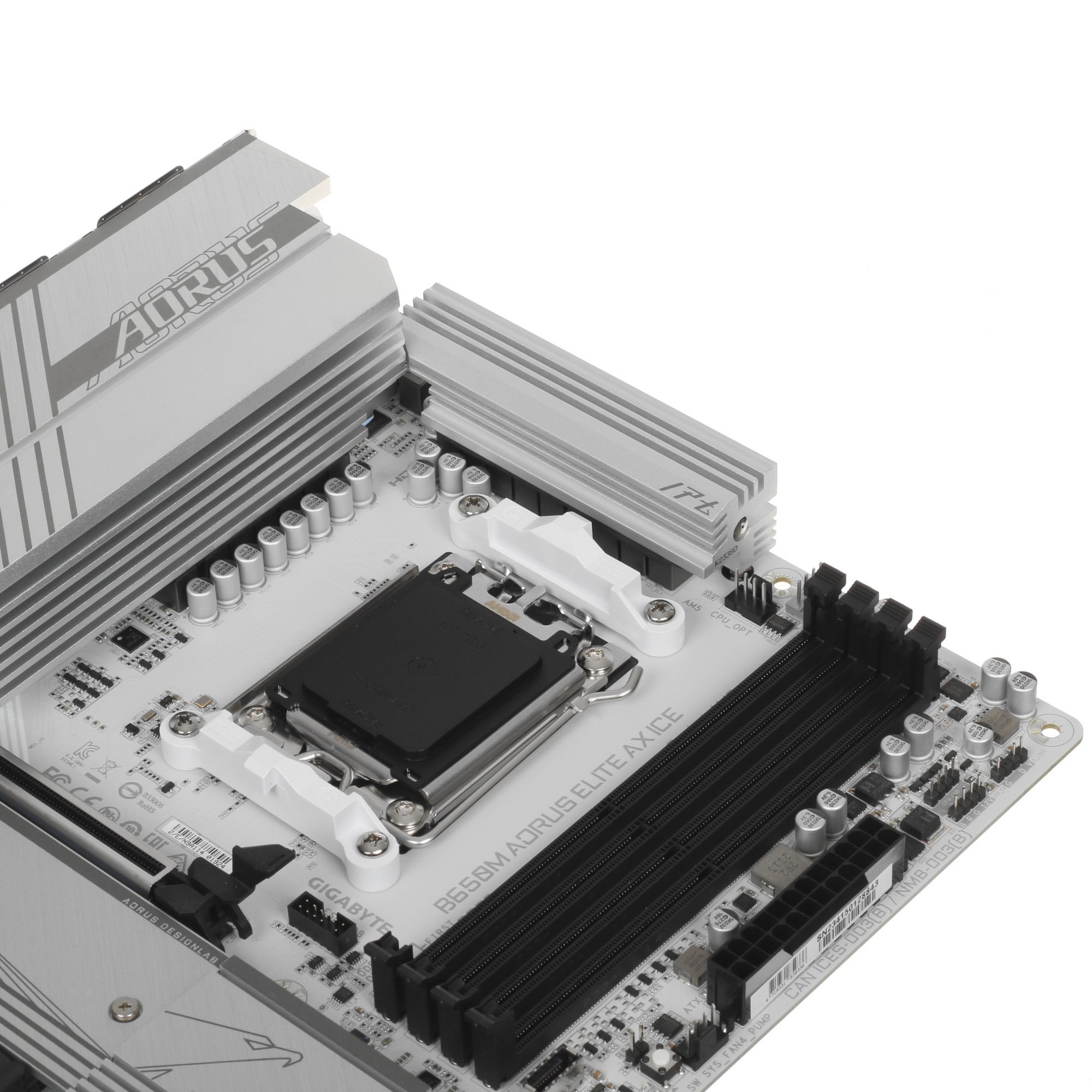 Материнская плата GIGABYTE B650M AORUS ELITE AX ICE имеет габариты, характерные для форм-фактора Micro-ATX (244x244 мм), и позиционируется как основа для сборки компактного системного блока домашней станции. За счет разъема подключения (сокета) AM5 на плату устанавливается процессор из линейки AMD, такой как AMD Ryzen 7000. Модель предполагает использование до 4 планок оперативной памяти стандарта DDR5 с тактовой частотой до 5200 МГц. Максимальная емкость установленной памяти может составить 256 ГБ.