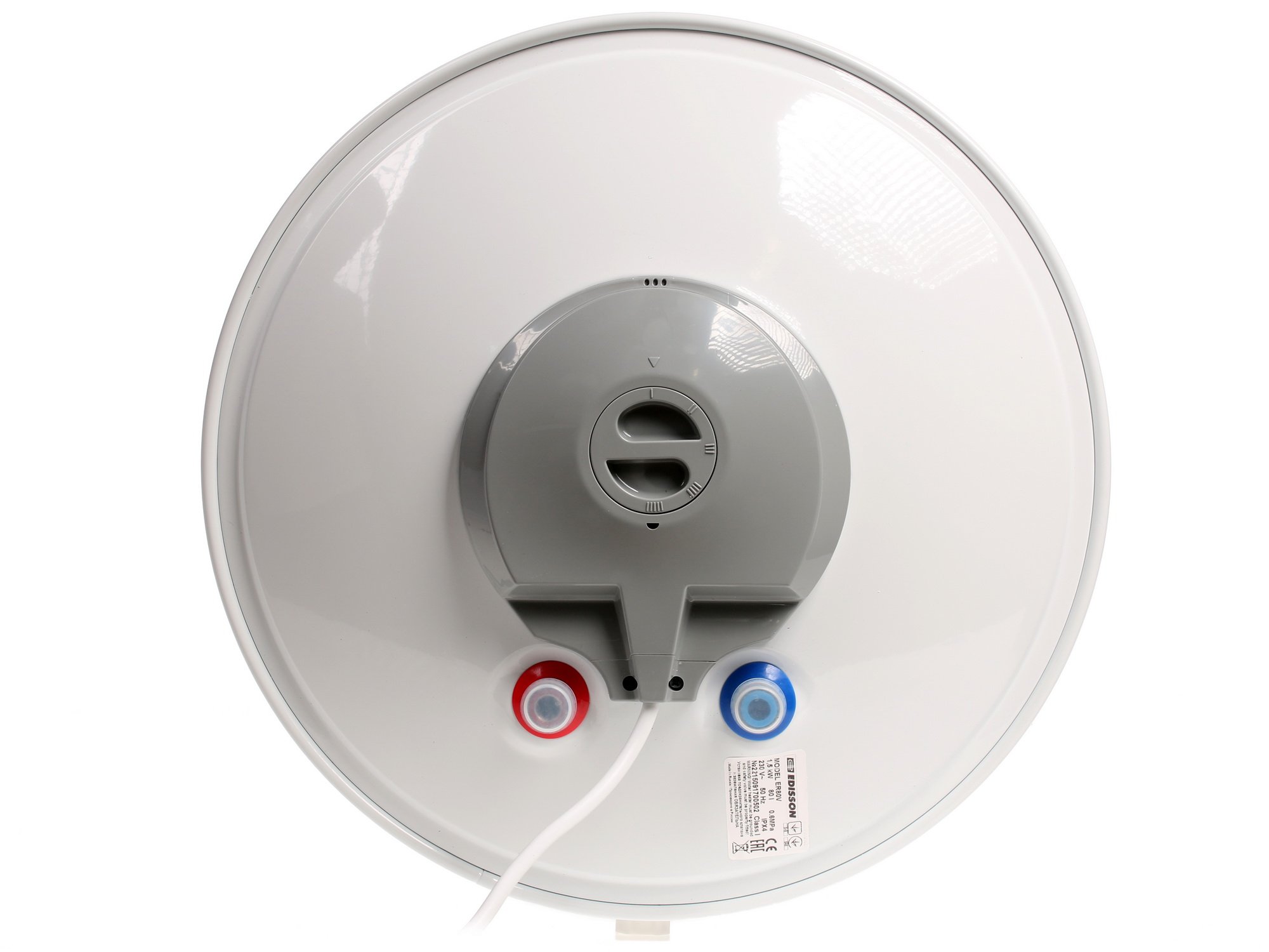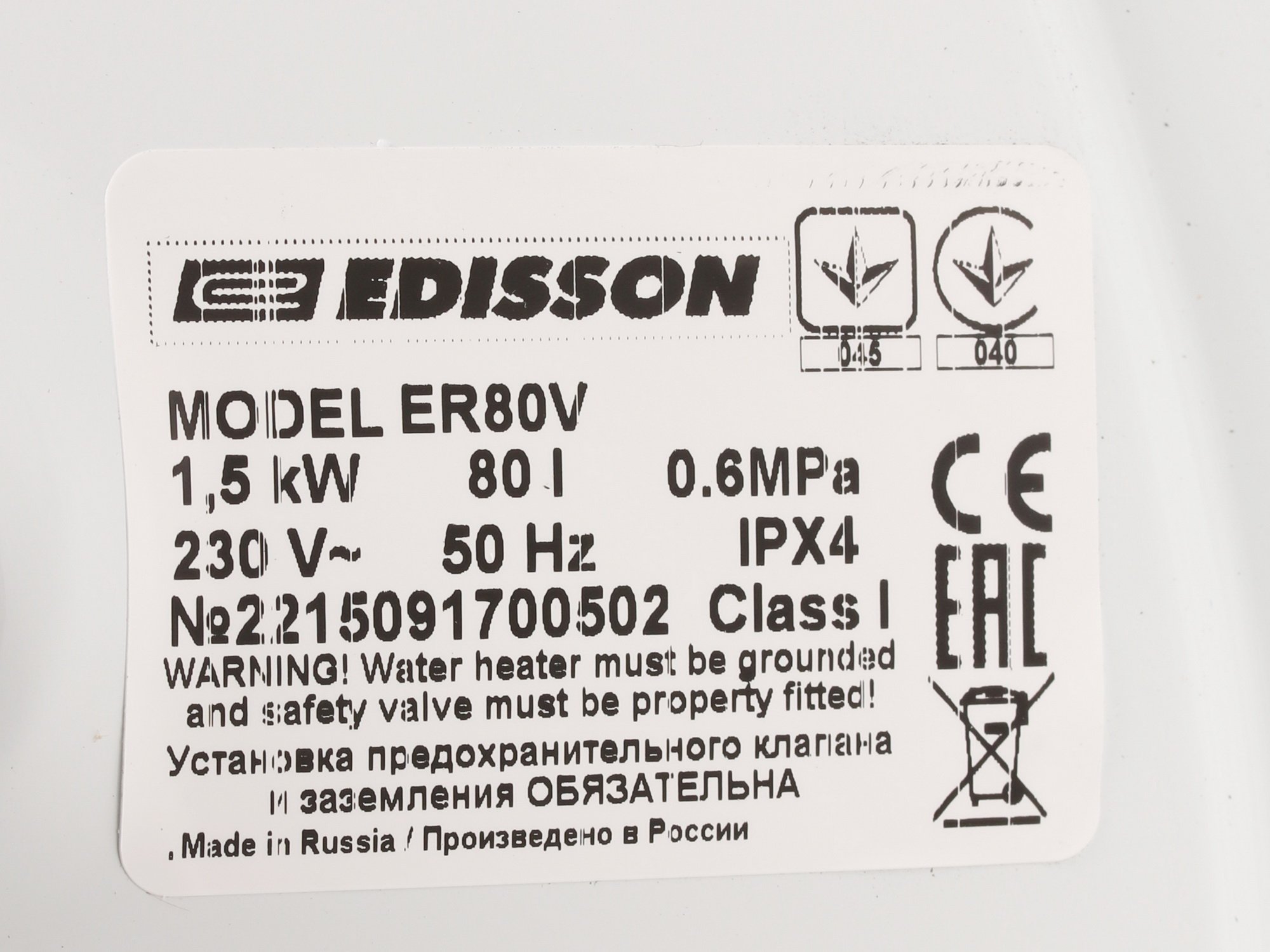 Edisson ER 80V имеет металлический корпус классического белого цвета, поэтому будет гармонировать с любой сантехникой и впишется в интерьер ванной. Крепится прибор к стене строго в вертикальном положении. Подводка трубы осуществляется только с нижней стороны. Встроенная функция “Автоотключение” срабатывает при достижении предельной температуры.
