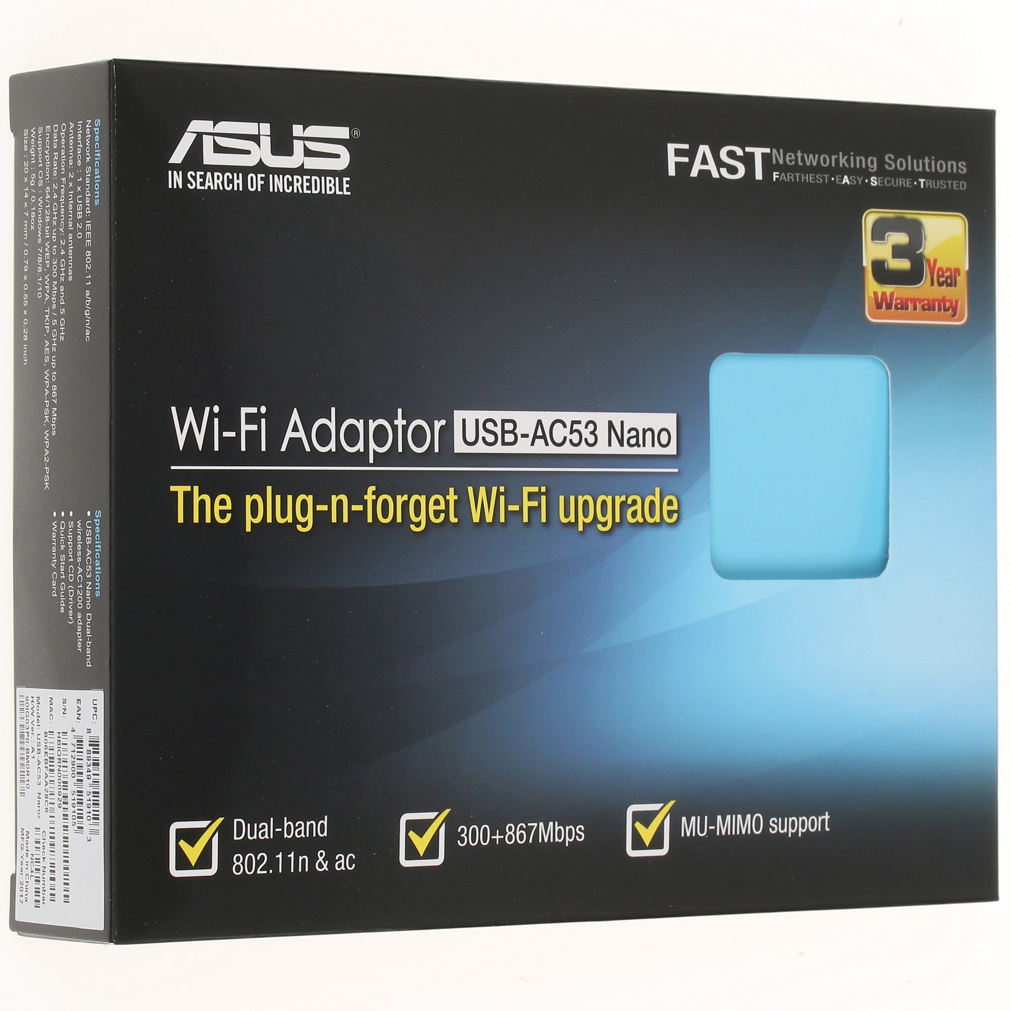 Wi-Fi адаптер ASUS USB-AC53 Nano будет полезен пользователям компьютеров любого типа: для установки устройства требуется лишь наличие USB-порта. Компактность устройства делает его использование удобным в любых условиях. Габаритные размеры корпуса адаптера составляют 20x14x7 мм. Разработчиком устройства предусмотрена поддержка операционных систем Windows 7, Windows 8 и Windows 10. Адаптер упакован в коробку, имеющую традиционный для продукции ASUS внешний вид.