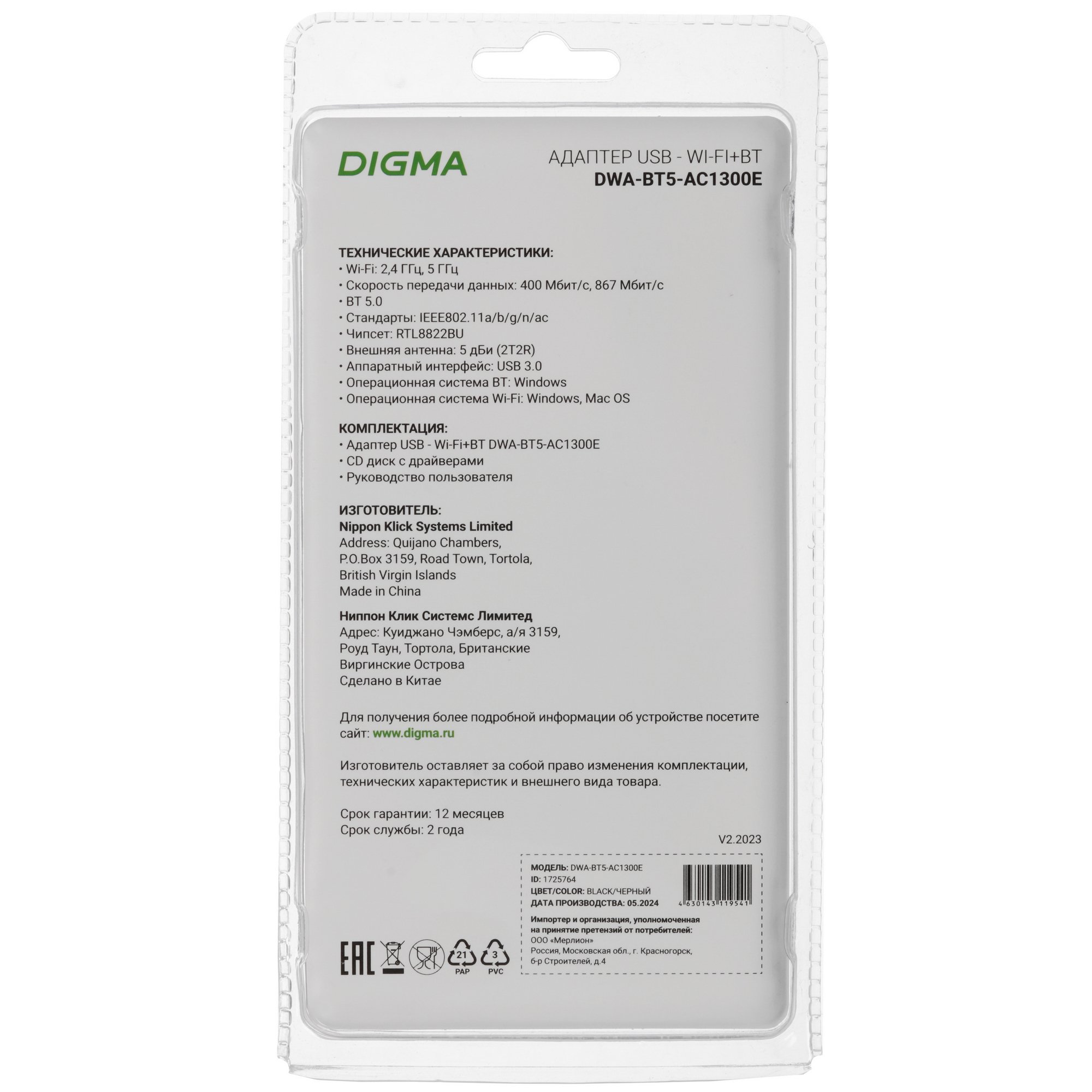 Сетевой адаптер WiFi + Bluetooth Digma DWA-BT5-AC1300E AC1300 USB 3.0 (ант.внеш.съем) 1ант. (упак.:1шт)