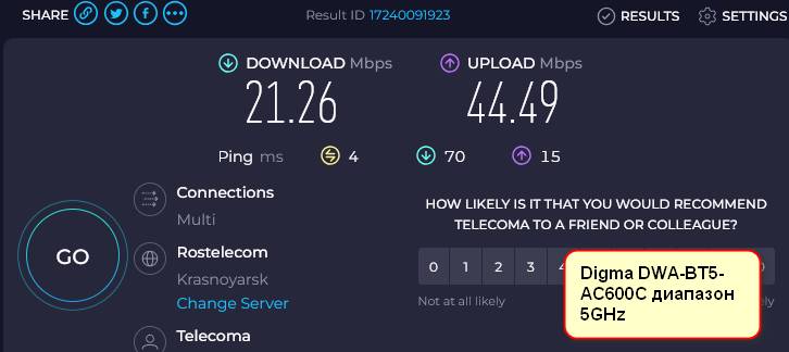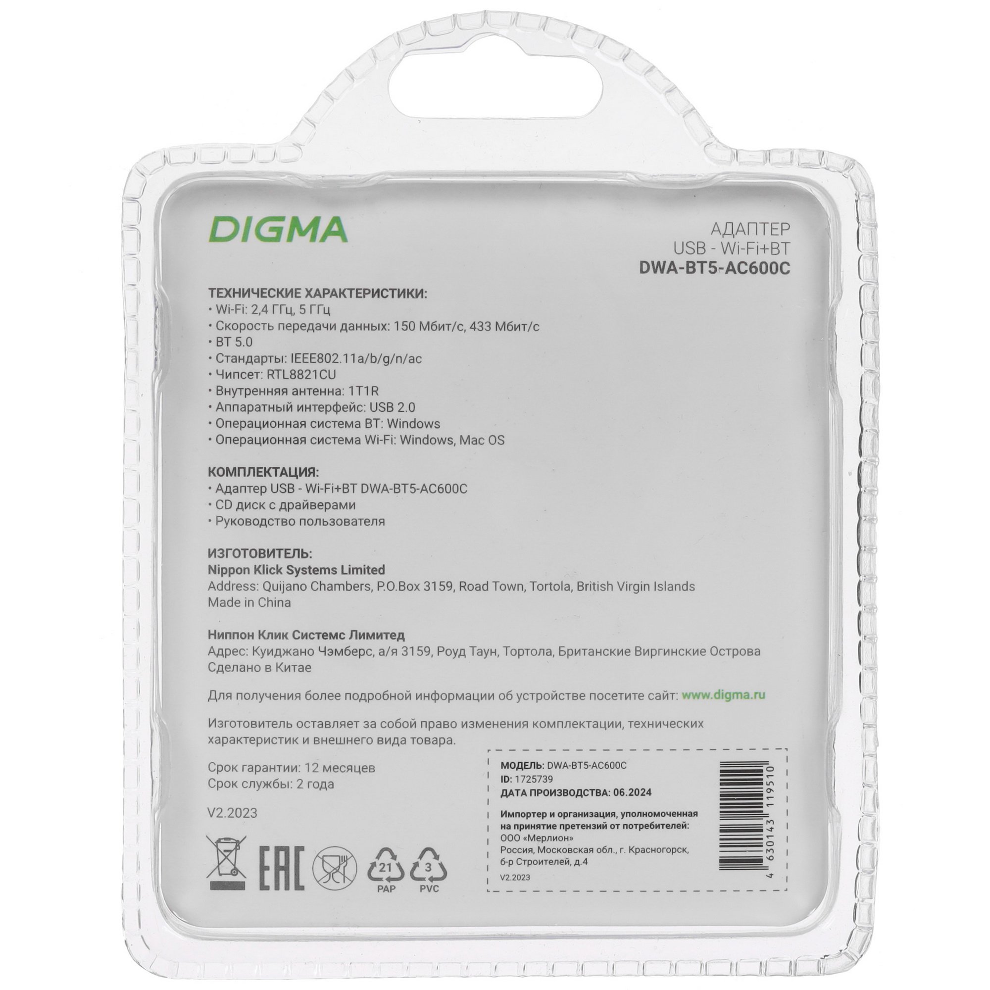 Стабильность беспроводных подключений обеспечивается интегрированной антенной внешнего сетевого адаптера Digma DWA-BT5-AC600C. Аксессуар располагает коннектором USB для подключения к компьютерному порту и использует интерфейс USB 2.0. Он может работать с ПК под управлением платформ Windows версий 7-11 или macOS.