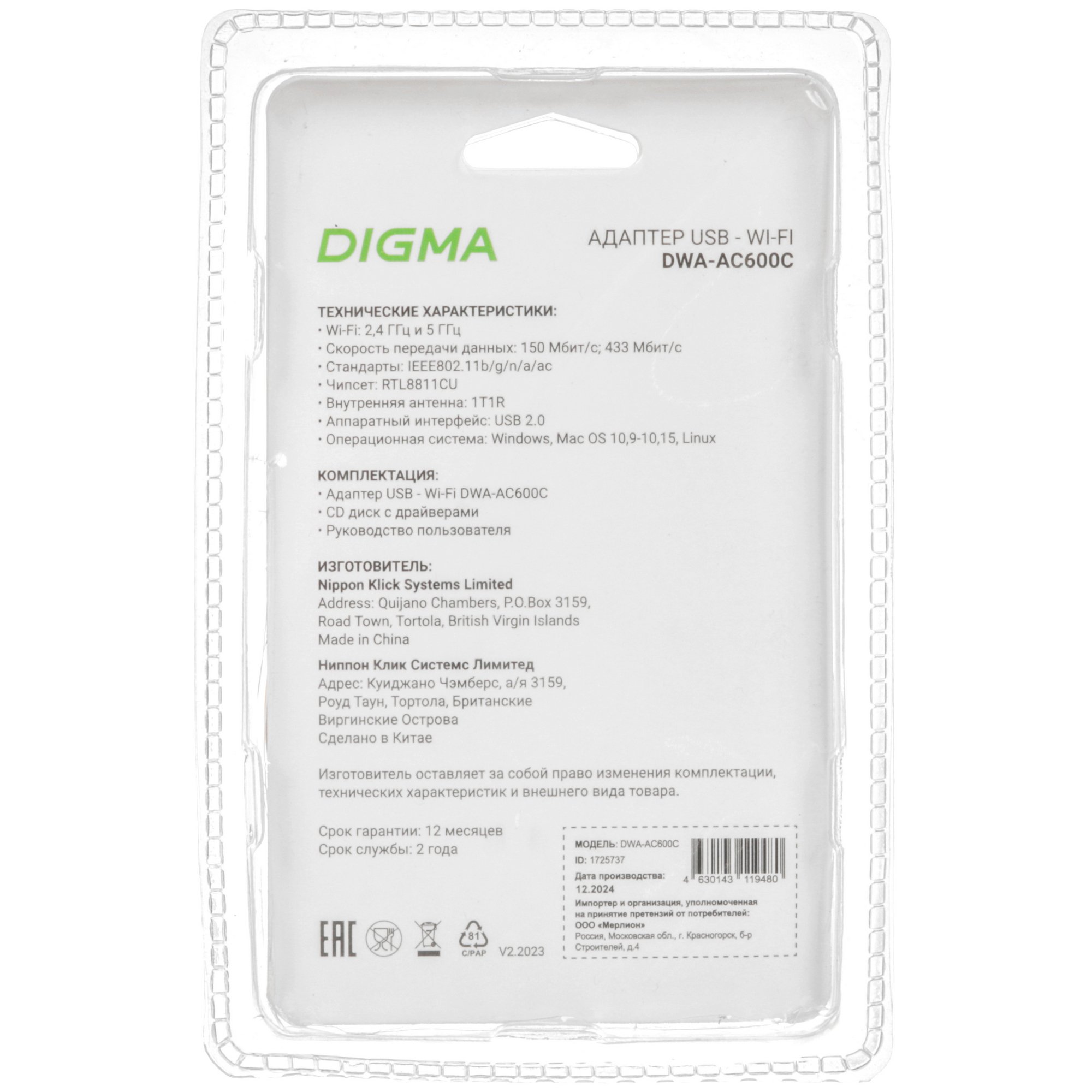 Сетевой адаптер WiFi Digma DWA-AC600C AC600 USB 2.0 (ант.внутр.) 1ант. (упак.:1шт)