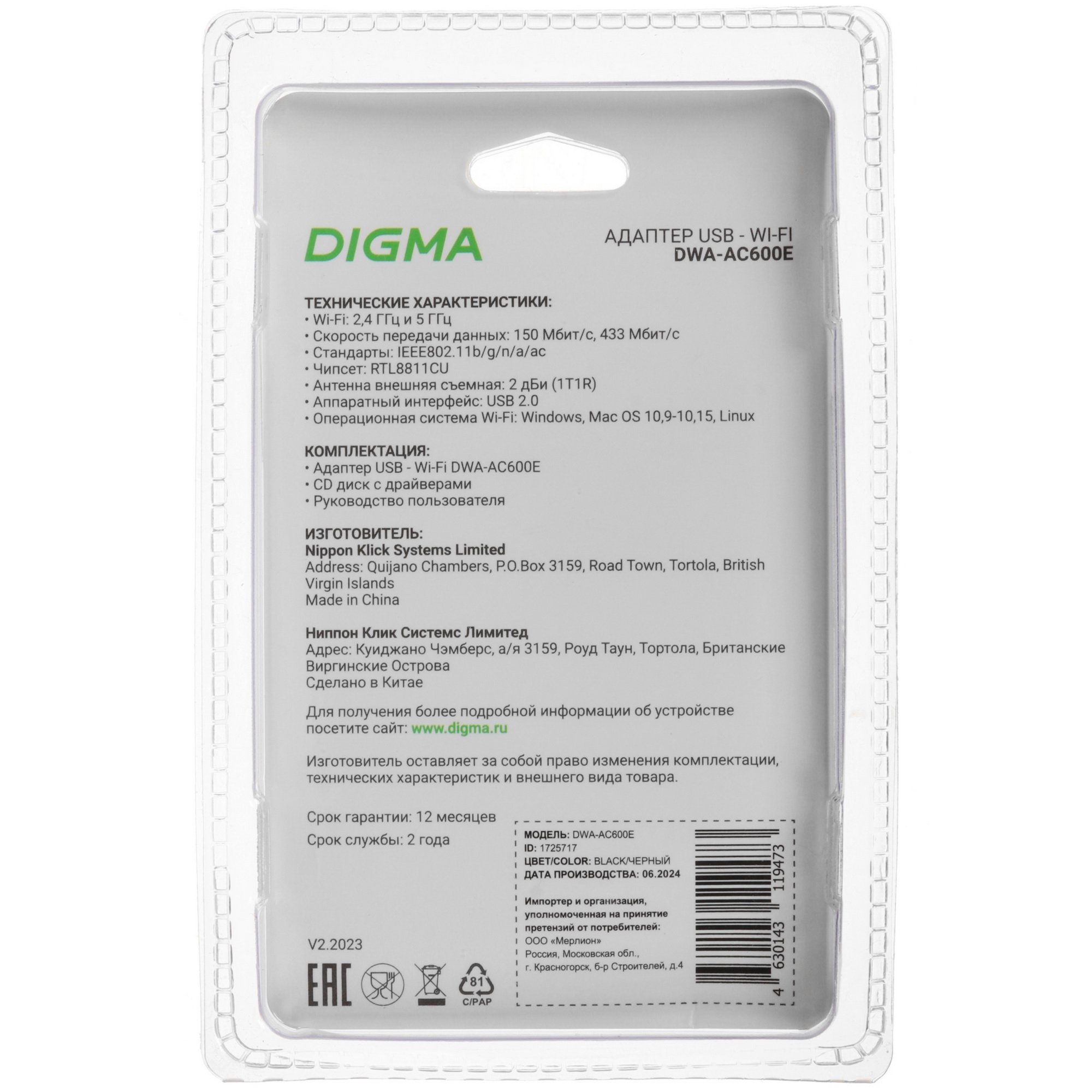Адаптер Wi-Fi-сети Digma DWA-AC600E поддерживает использование с устройствами на платформах Linux, Windows версий 7-11 и macOS. К изделию прилагается носитель с драйверами, которые призваны обеспечить его стабильную работу с ПК. Для стабильного подключения Wi-Fi аксессуар располагает наружной отсоединяемой антенной с усилением 2 dbi.